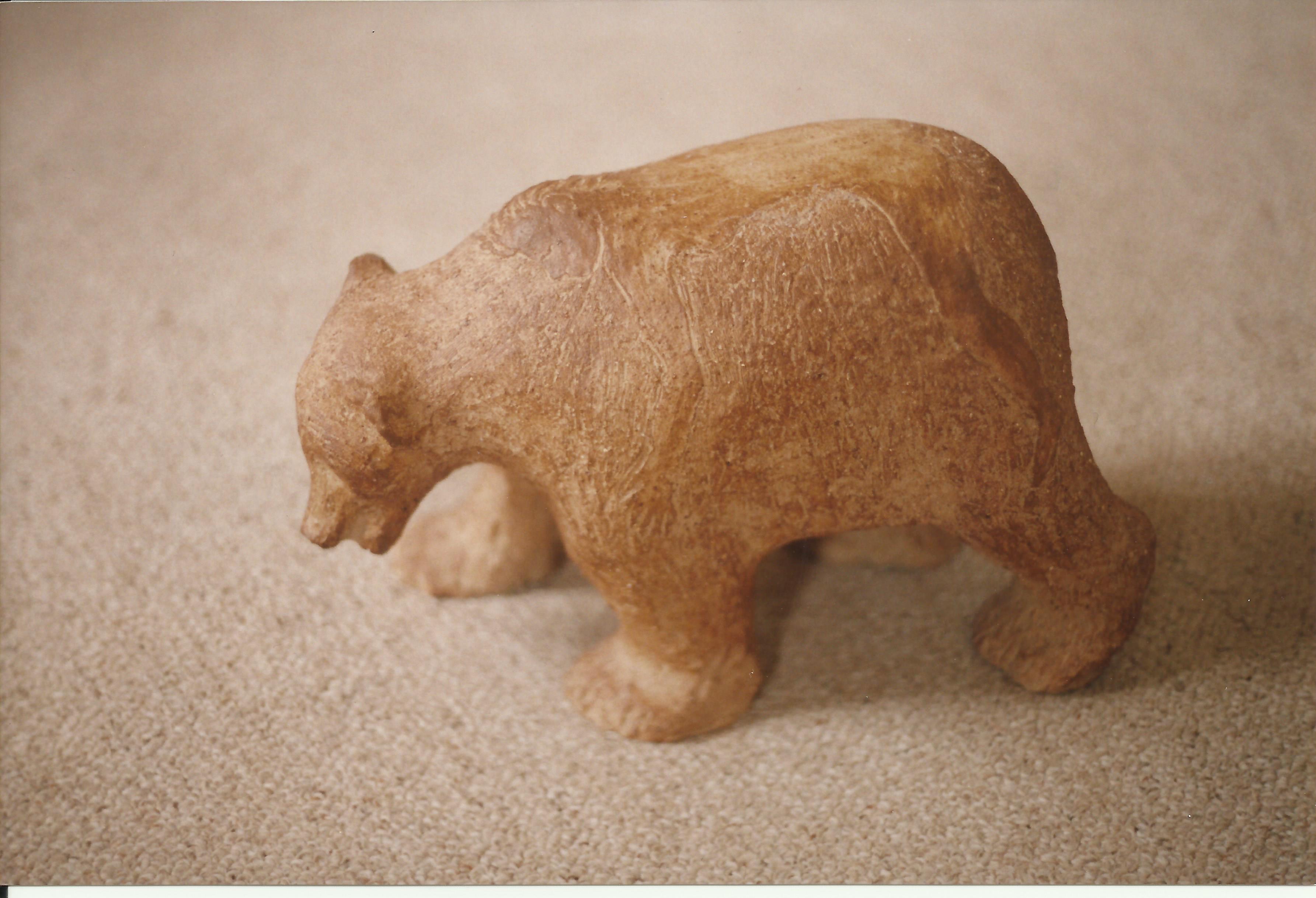 Jeg kastede mig over at bruge dyrefigurer som dekorativt element. Dette blev gjort ved at klippe skabeloner ud af avispapir, lægge dem på det fugtige ler og duppe sort farve omkring. Jeg kastede mig også ud i en modellering af en bjørn med en kvindeskikkelse ovenpå, inspireret af eventyret om Kvitebjørn kong Valemon.