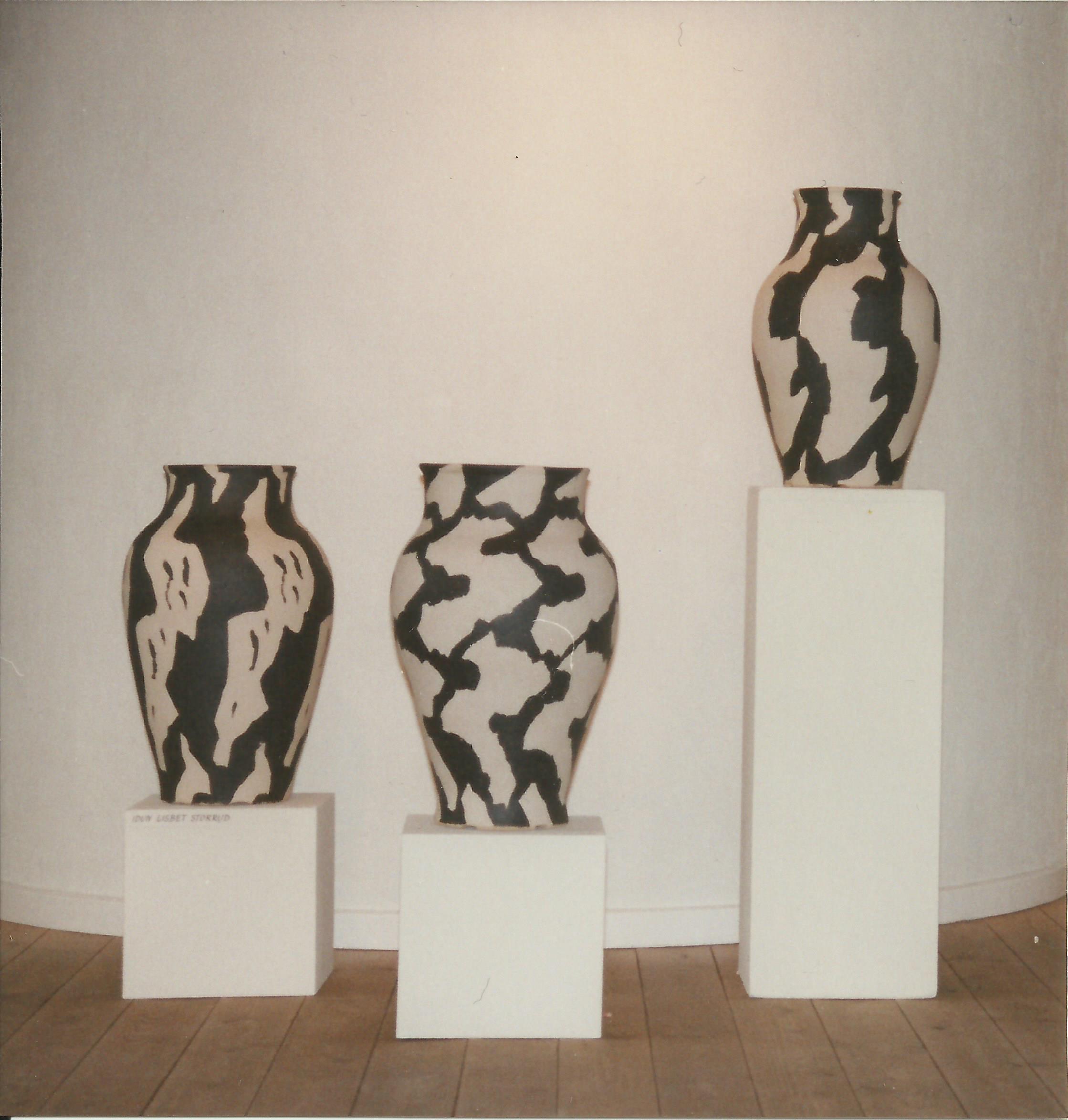 Året efter var temaet Corpus. Som keramiker var det naturligt at tage fat i krukkeformen. I fagsproget er der mange referencer til menneskekroppen. En krukke har skuldre og hals, og den kan have ører. Jeg gav mig til at dreje krukker der var ret klassiske i formen, og dekorerede dem med sort begitning (lerfarve) på det hvide stentøjsler. Jeg blev helt bidt af at variere overfladen med gentagelsesmønstre ved hjælp af papirskabeloner og skraveringer, en besættelse jeg ikke er kommet mig over endnu, over 20 år efter.