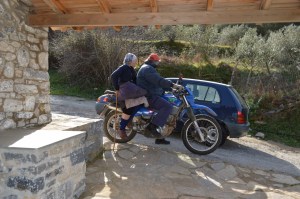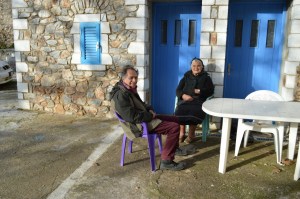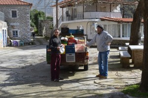 Vi bor mest i Dimitris hus i Trachila. Det ligger ved kysten hvor det er lunere, og både huset og haven er større og mere praktisk indrettet. Men mit hus i Milea er også dejligt, så en gang i mellem tager vi en lille tur derop. Det tager ca. en halv times tid at køre derop i bil, og så er man pludselig i en helt anden verden. Det der gør det så forskelligt, er ikke bare at den ene landsby ligger ved havet og den anden i bjergene. Det er også det at Trachila er en “død” landsby. Her om vinteren er der kun os og en håndfuld pensionister der bor der. Folk er flyttet til Athen for at få arbejde, og bruger nu kun deres huse som feriebolig om sommeren. Noget af den samme tendens gør sig også gældende i Milea, men der er stadig mennesker som bor og arbejder i landsbyen. Der er tre store og flere mindre landbrug med kvæg, geder og får, der er flere kafeer der er åbne hele året og der er familier med børn der bliver hentet med skolebussen hver morgen. Det gør en stor forskel