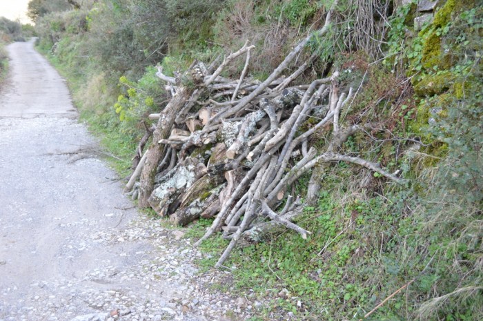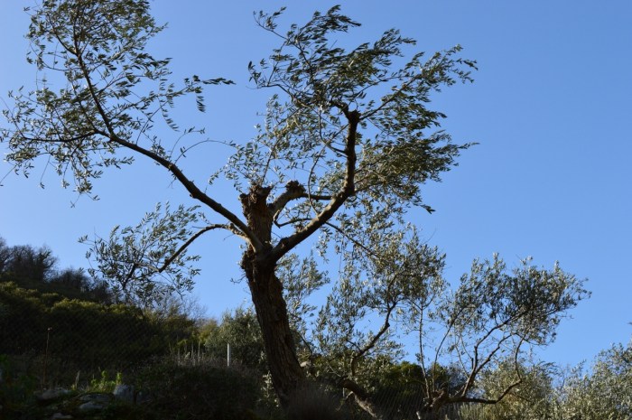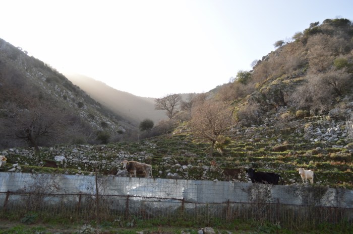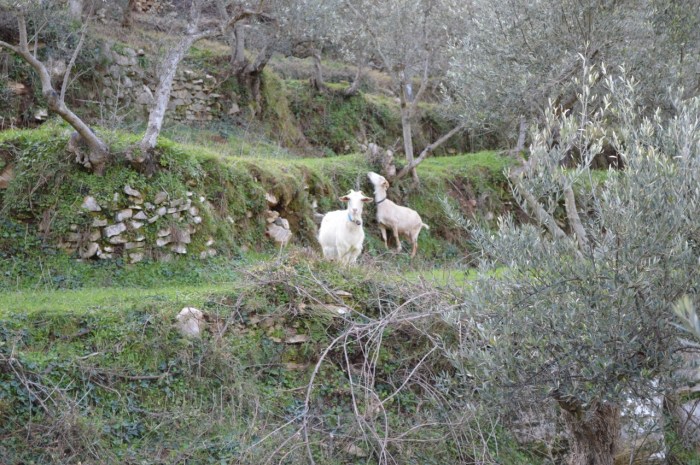 På begge sider af vejen er der olivenlunde med og uden geder. Oliventræerne bliver høstet i november og december, og som regel beskåret kraftigt ved samme lejlighed. Har man nok oliventræer, er man også selvforsynende med brænde til hele vinteren.