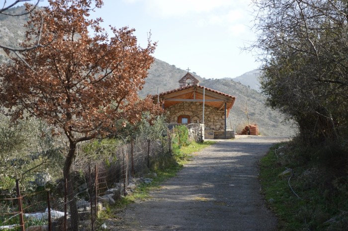 Vi besluttede at gå en tur op til Sulka i det dejlige vejr. Jeg bor i den nedre del af Milea, kaldet Kato Chora. Sulka ligger i en dal sydøst for byen, så vi må først gå igennem den mellemste del af Milea, Fagrianika. Herefter følger vi landbrugsvejen indover den sydlige dalside.