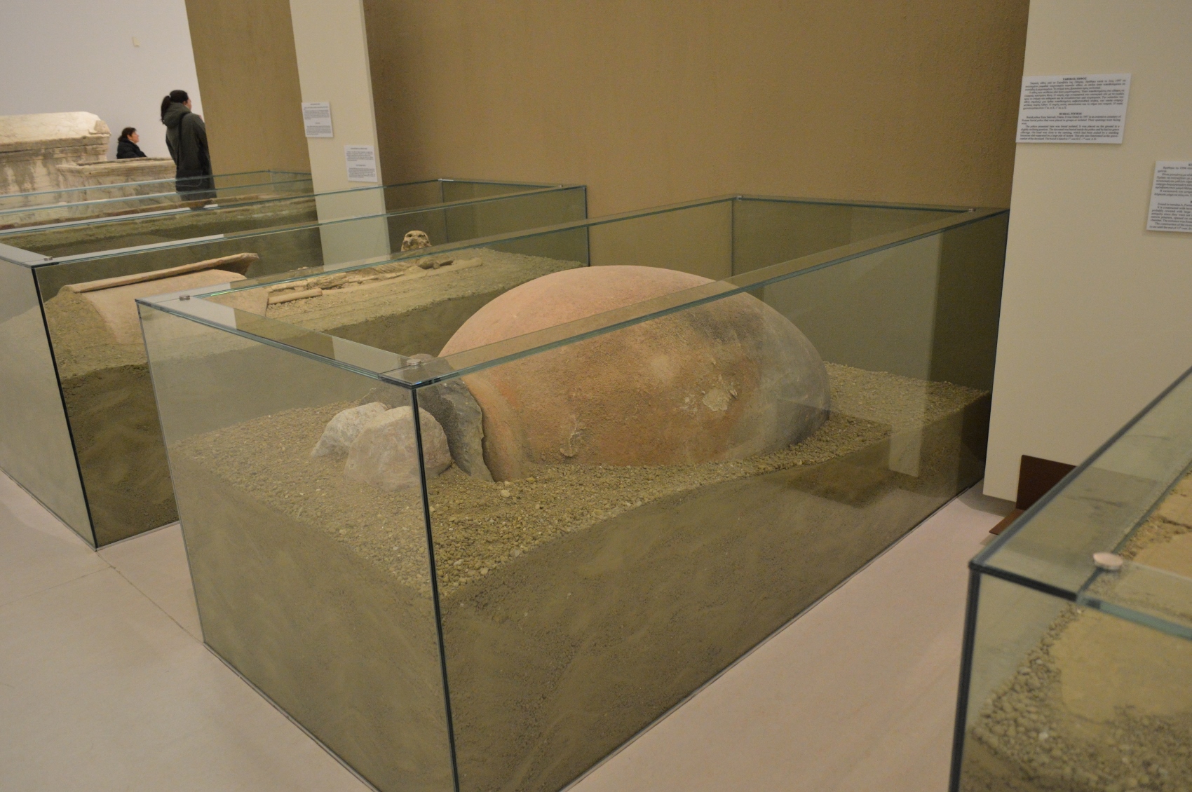 I denne gravurne fra romersk tid, blev den afdøde placeret med hovedet mod åbningen, som var lukket med et stykke kalksten. Jeg har hørt at dette at man begravede de døde i krukker, er forløberen for at man stadig i dag bruger lerkrukker, urner, af lignende form til asken efter kremering.