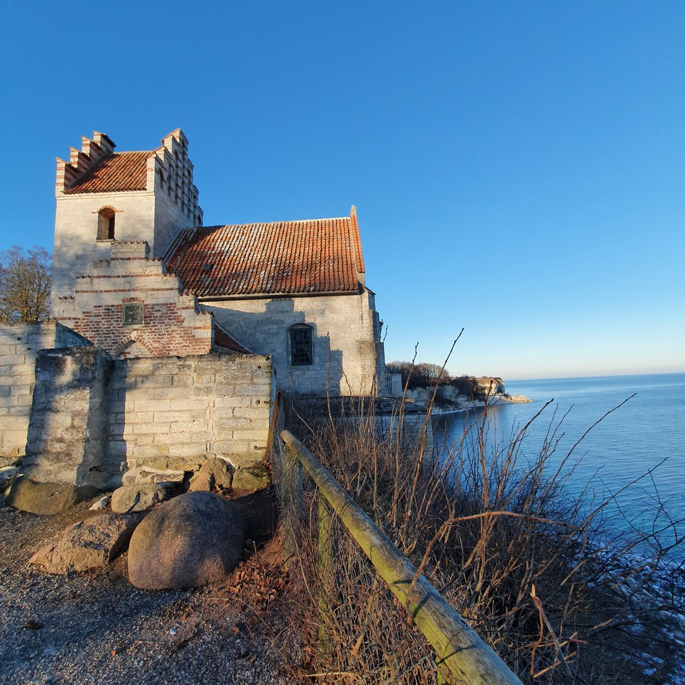 Udsigt mod Højerup kirke. Det er klogt ikke at gå for tæt på kanten, for der falder en gang i mellem store kridtblokke ned på strande.