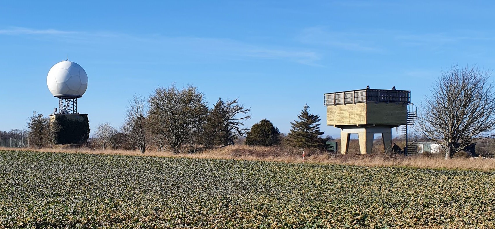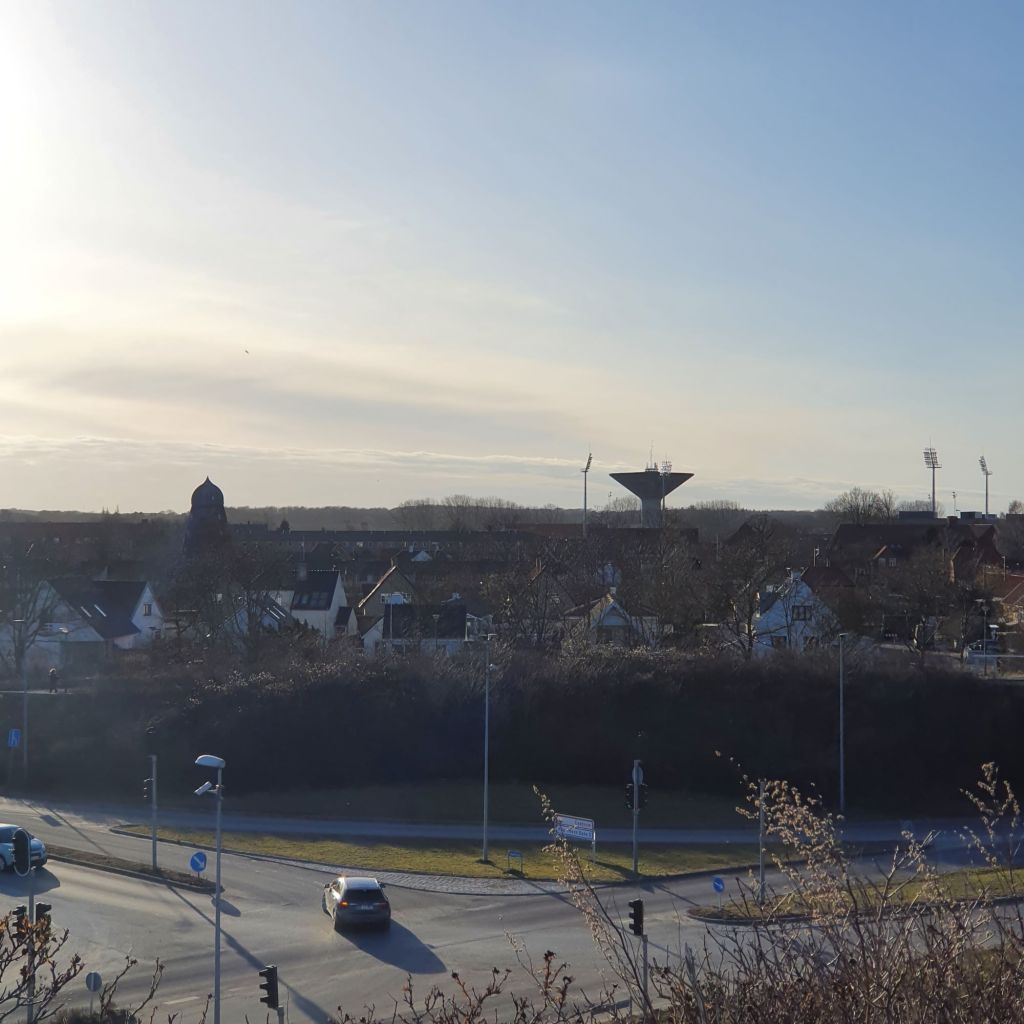 I stedet må man længere ind i landet før man kan komme op på en gangbro, som fører over vejen, op på en kunstig bakke. Her er udsigt over byen, og vi kan se den gamle mølle, som ikke længere har vinger, og det jeg kalder det nye vandtårn. Det er fra 1972, så helt nyt er det ikke, men jeg er gammel nok til at huske at det blev bygget. Det ligner en svamp, og med sine 42 meter, kan det ses langvejs fra.