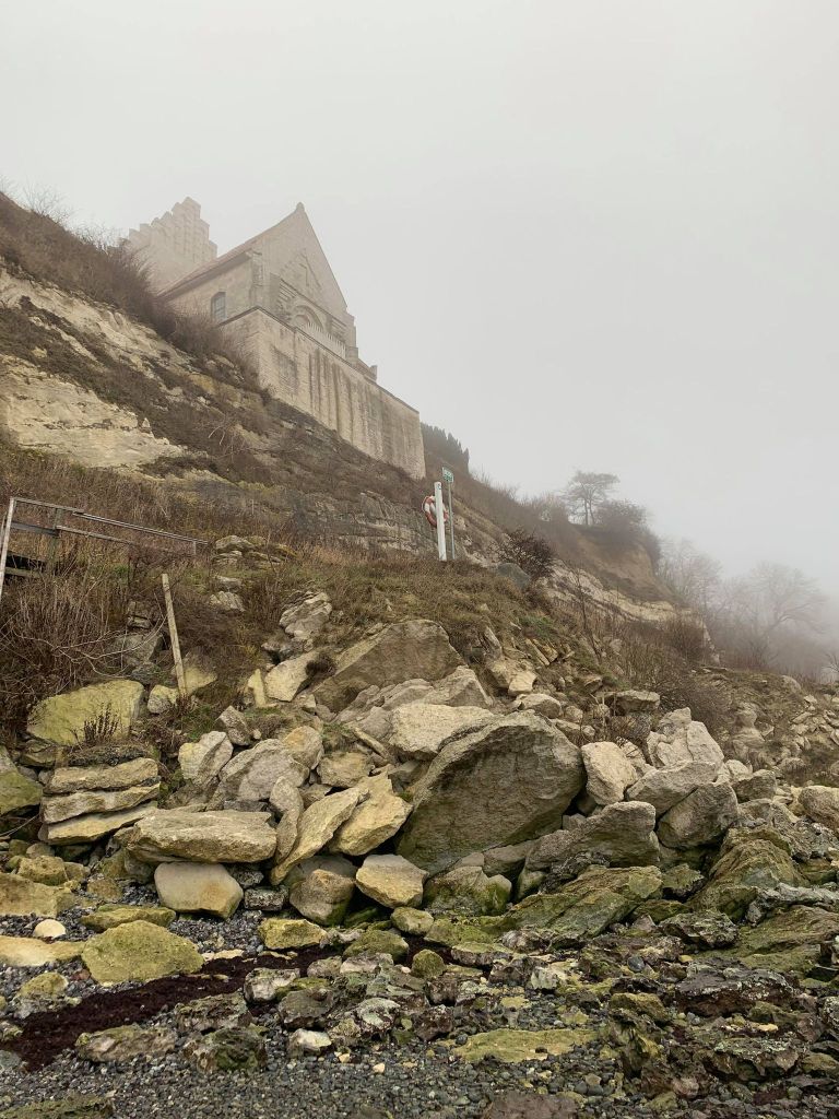 Nede fra stranden kan man se hvordan kirken er blevet forstærket, der hvor et stykke er faldet af.