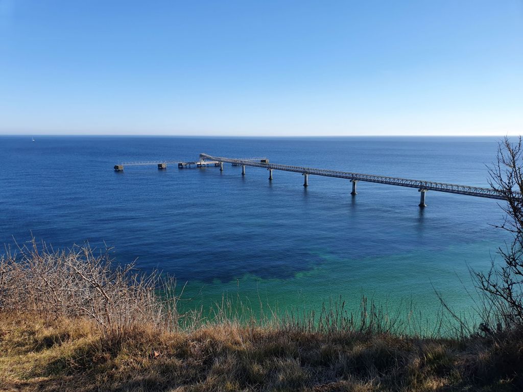 Et langt transportbånd gør det nemt at losse det på fragtskibene. På grund af kridtet har vandet en farve som kan få en til at drømme om Middelhavet.