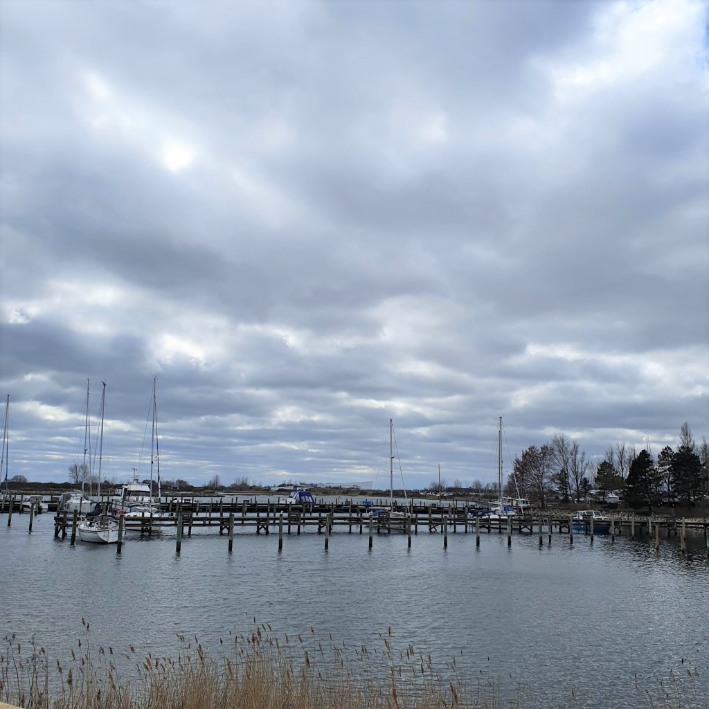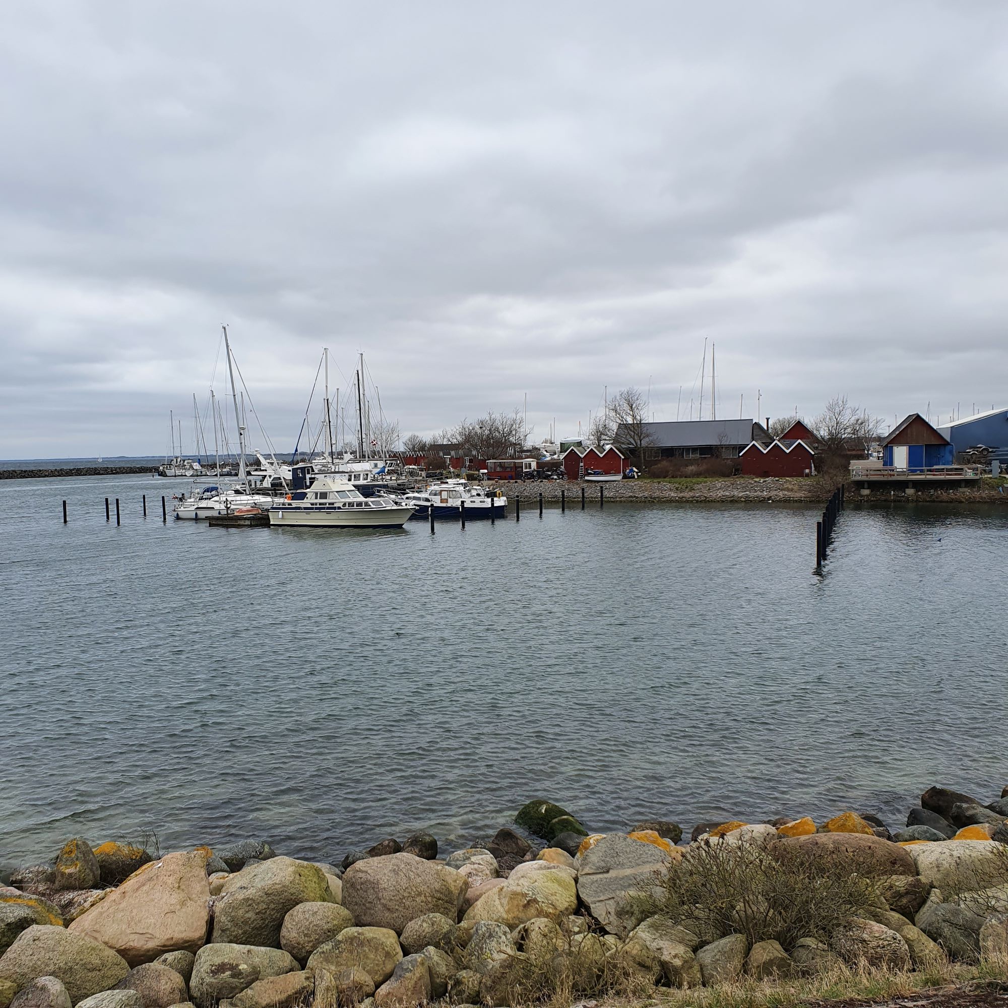 Vejret var overskyet, uden regn, som nok er mit foretrukne vandre-vejr. Jeg synes også ofte mine fotos bliver bedre når det ikke er for hårdt lys. Her lige efter Strøby Ladeplads havn.