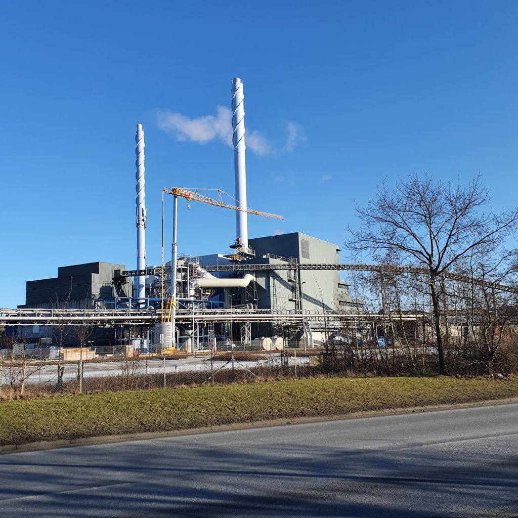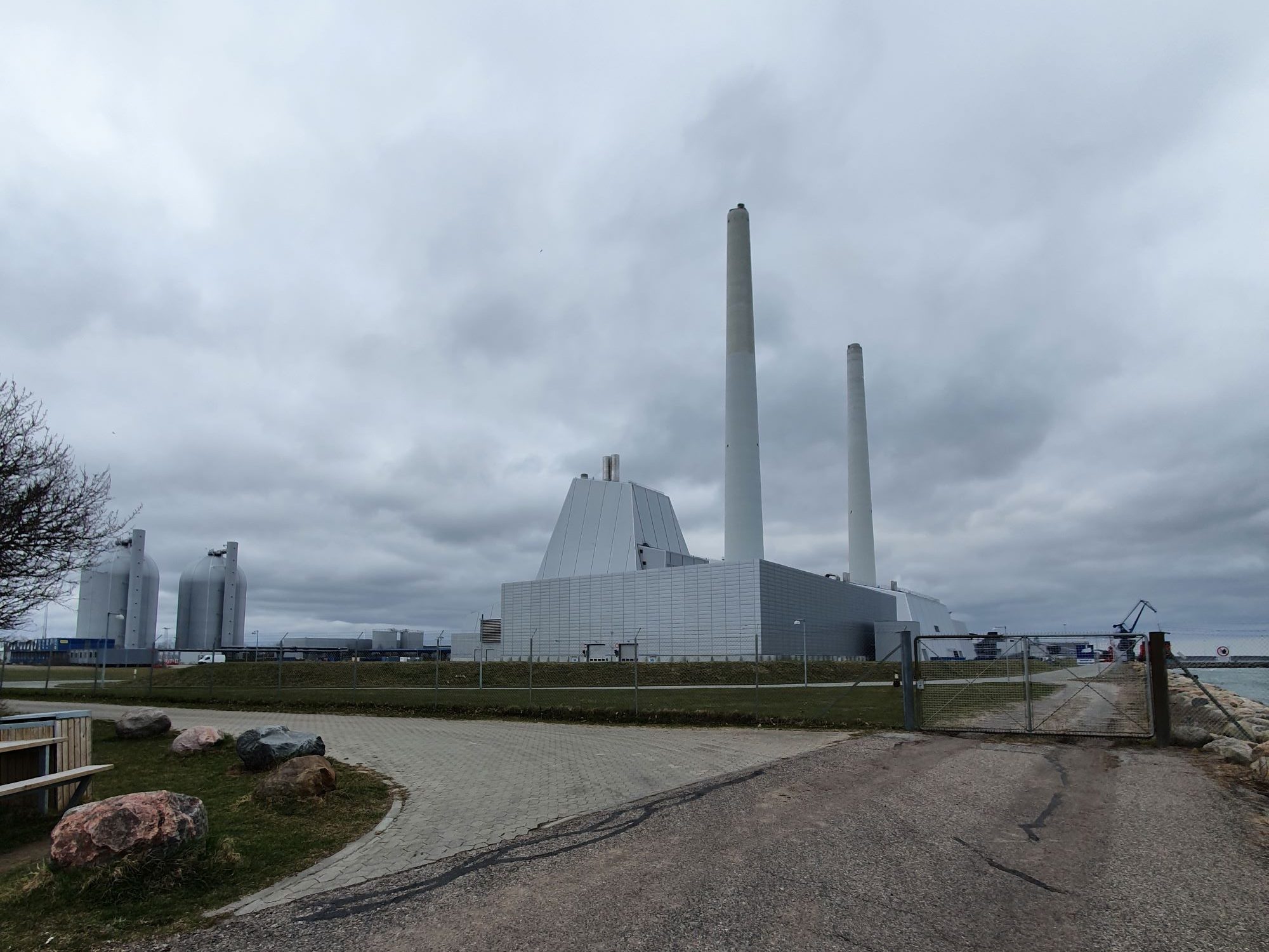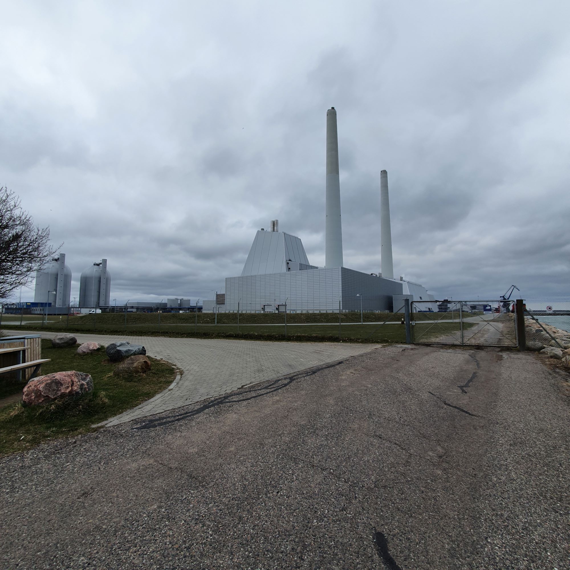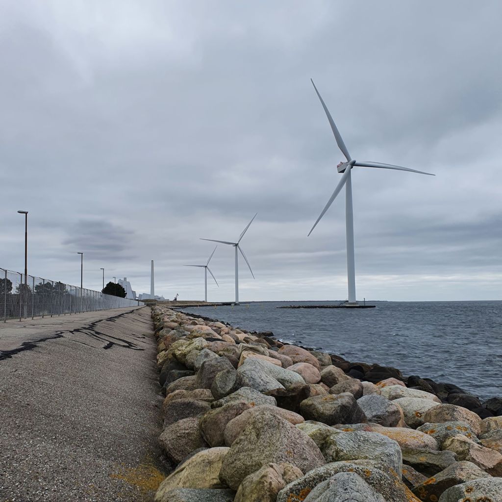 På vandsiden ligger tre store vindmøller, og lige efter kommer det store kraftvarmeværk.