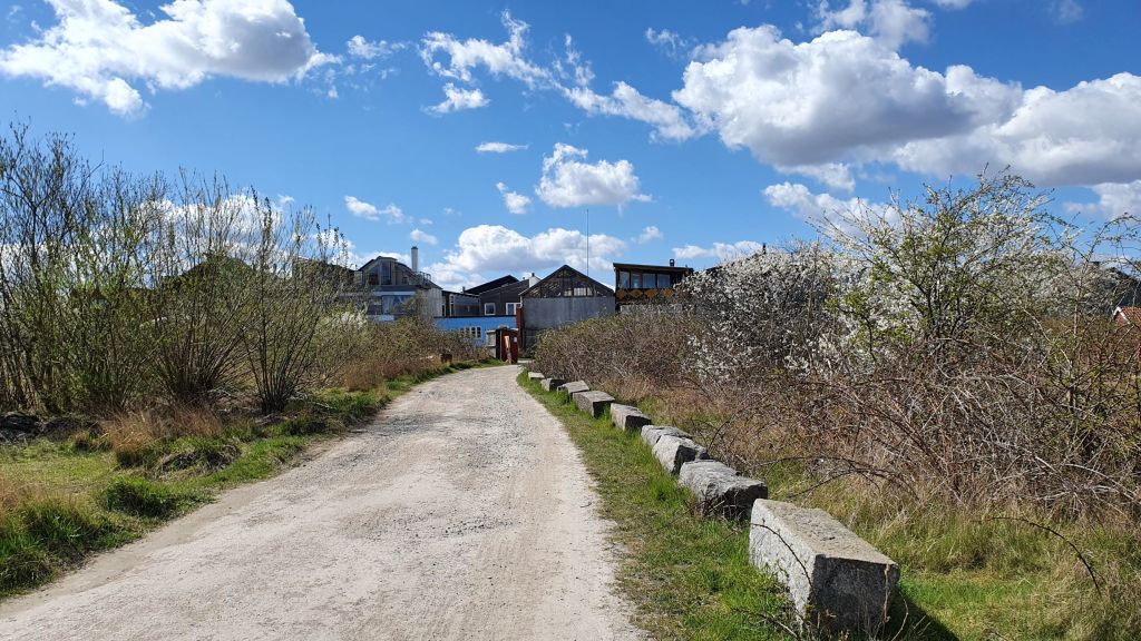 Der går en fin sti mellem vandet og en række gamle sommerhuse.