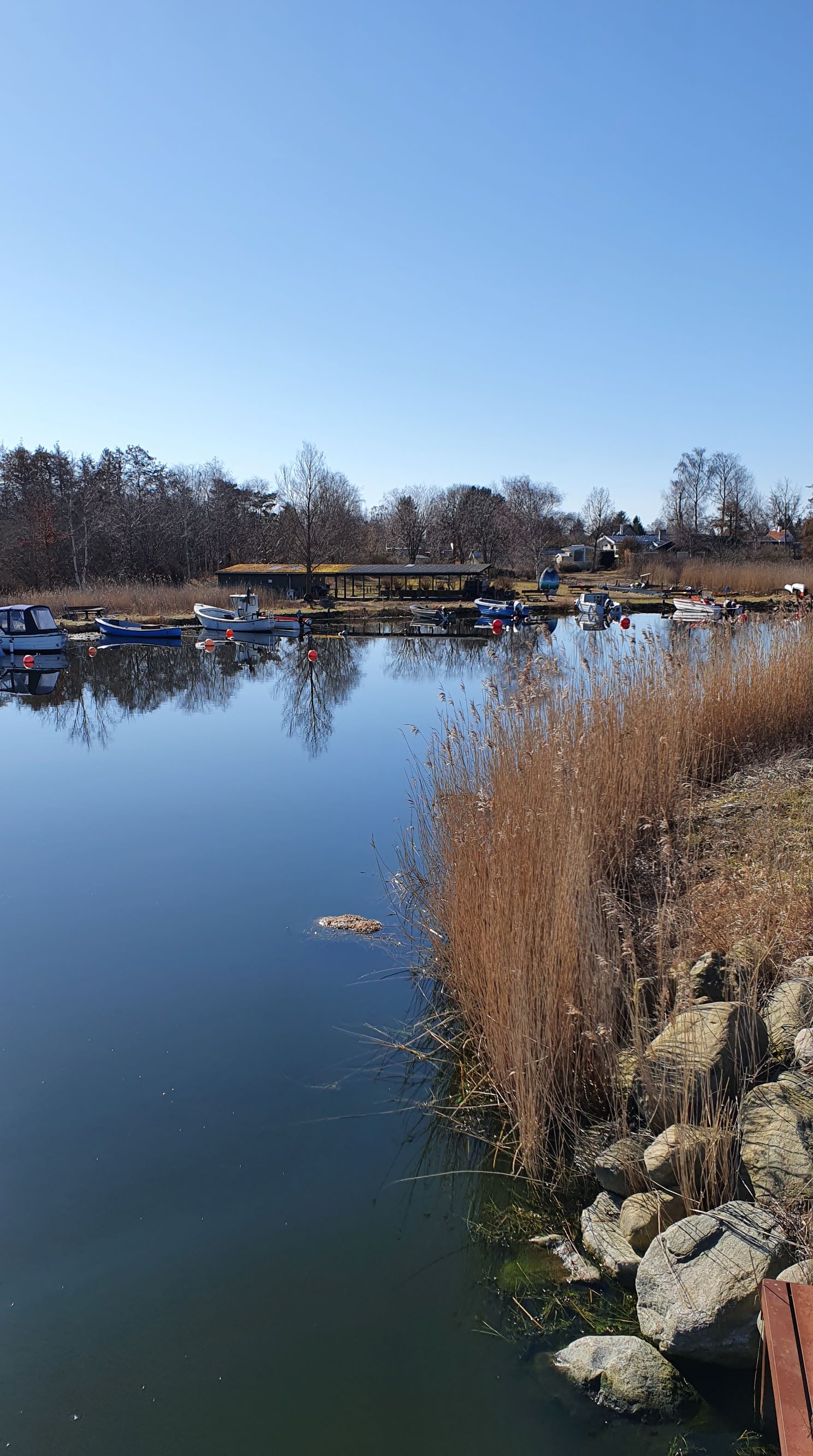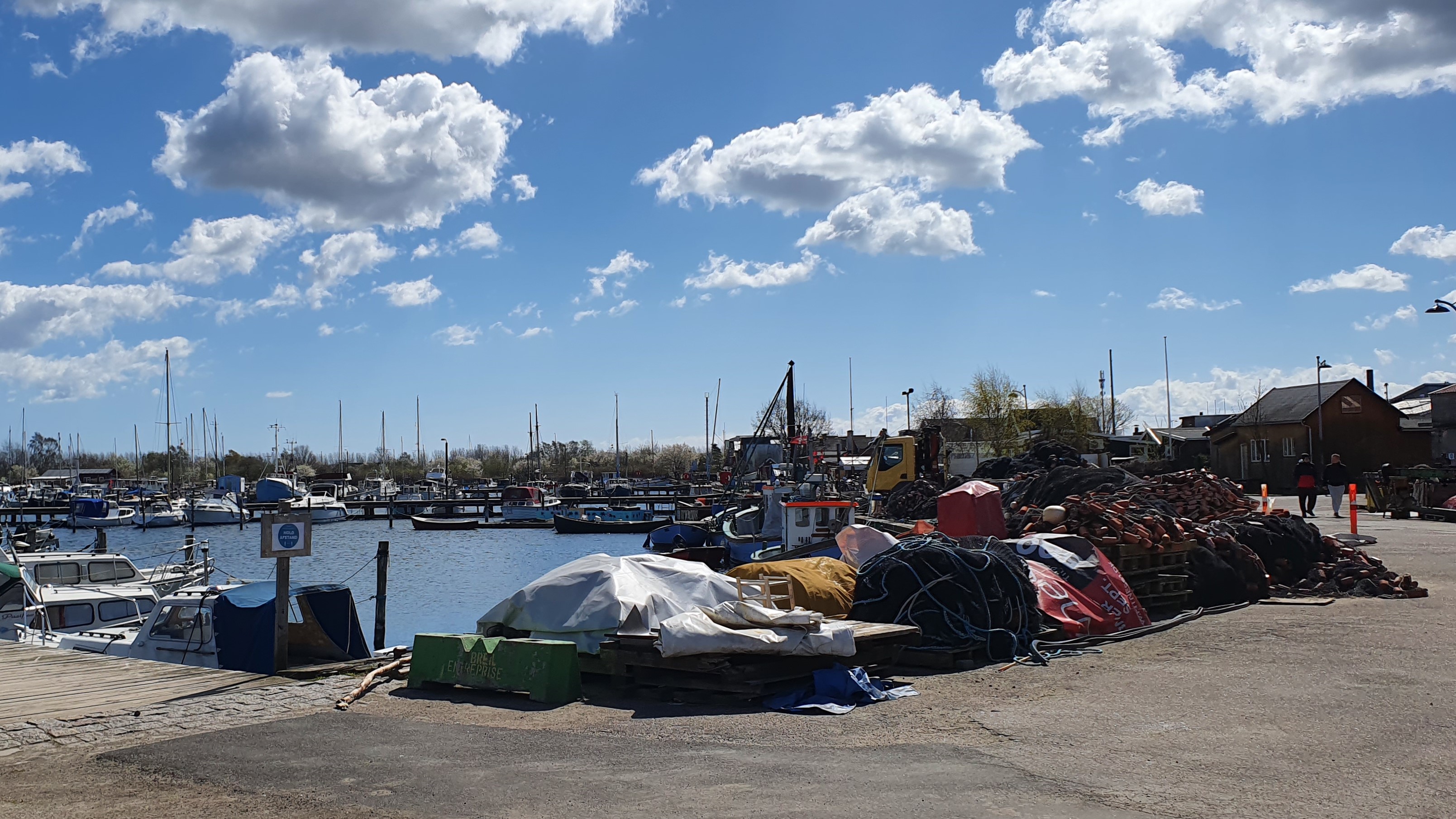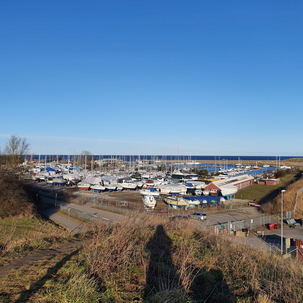 Til den anden side kan vi se ned på marinaen. Den er egentlig mere interessant end det ser ud på billedet, og der arbejdes stadig på at gøre det bedre. Foruden plads til en masse både, er der også et havnebad, med faciliteter for vinterbadere, der er stier, bænke og læ-pavillionner og diverse spisesteder, som er åbne når der ikke er corona. restriktioner. Nogle af anlægsarbejderne har også en mere dyster baggrund. På grund af klimaforandringerne forventer man at havet vil stige i de kommende år, og der laves derfor kystsikring i form af diger.
