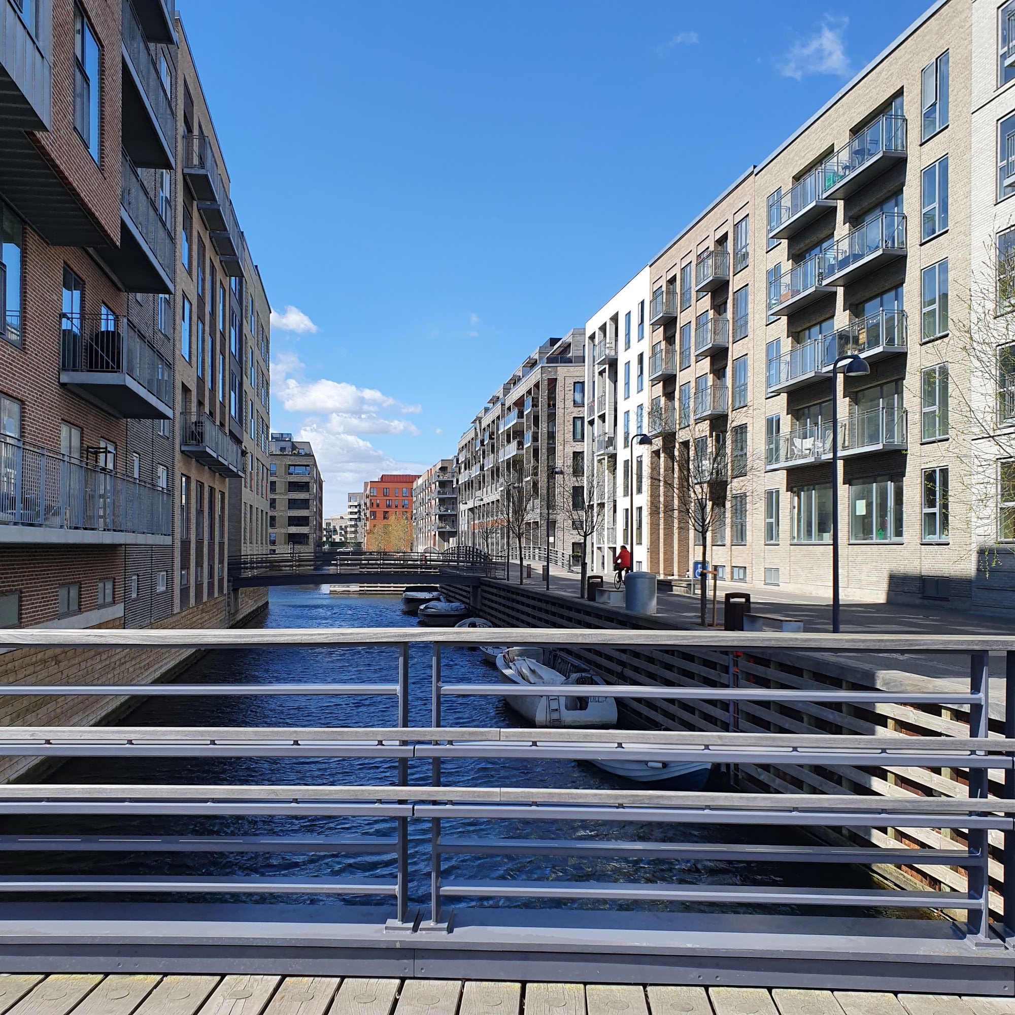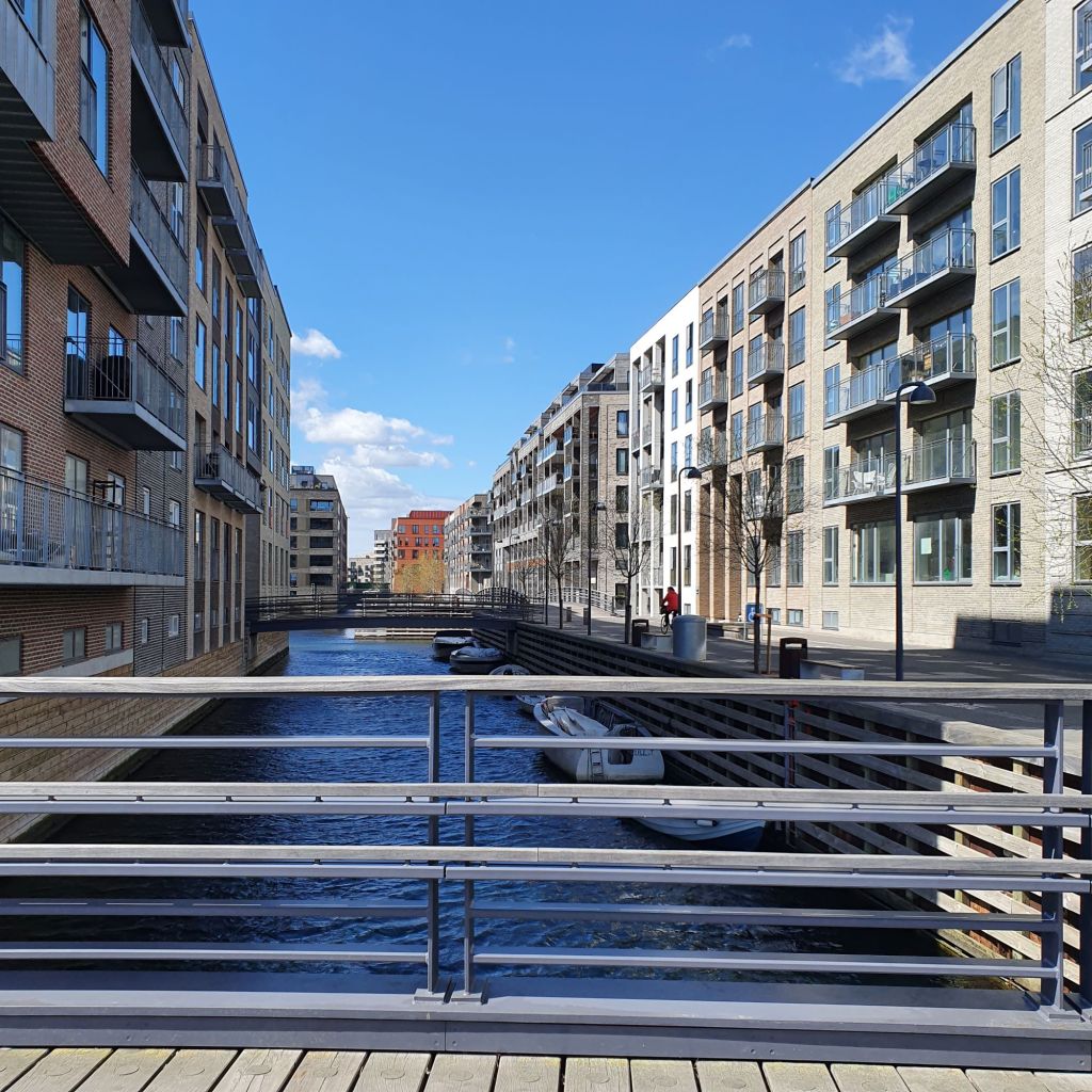 På den anden side af Sydhavnsgade ligger en del af København som jeg overhovedet ikke kender . Det er et ret nyt boligområde, Sluseholmen, opført på gamle industrigrunde, og de er lavet så hver af de otte karréer har vand omkring.