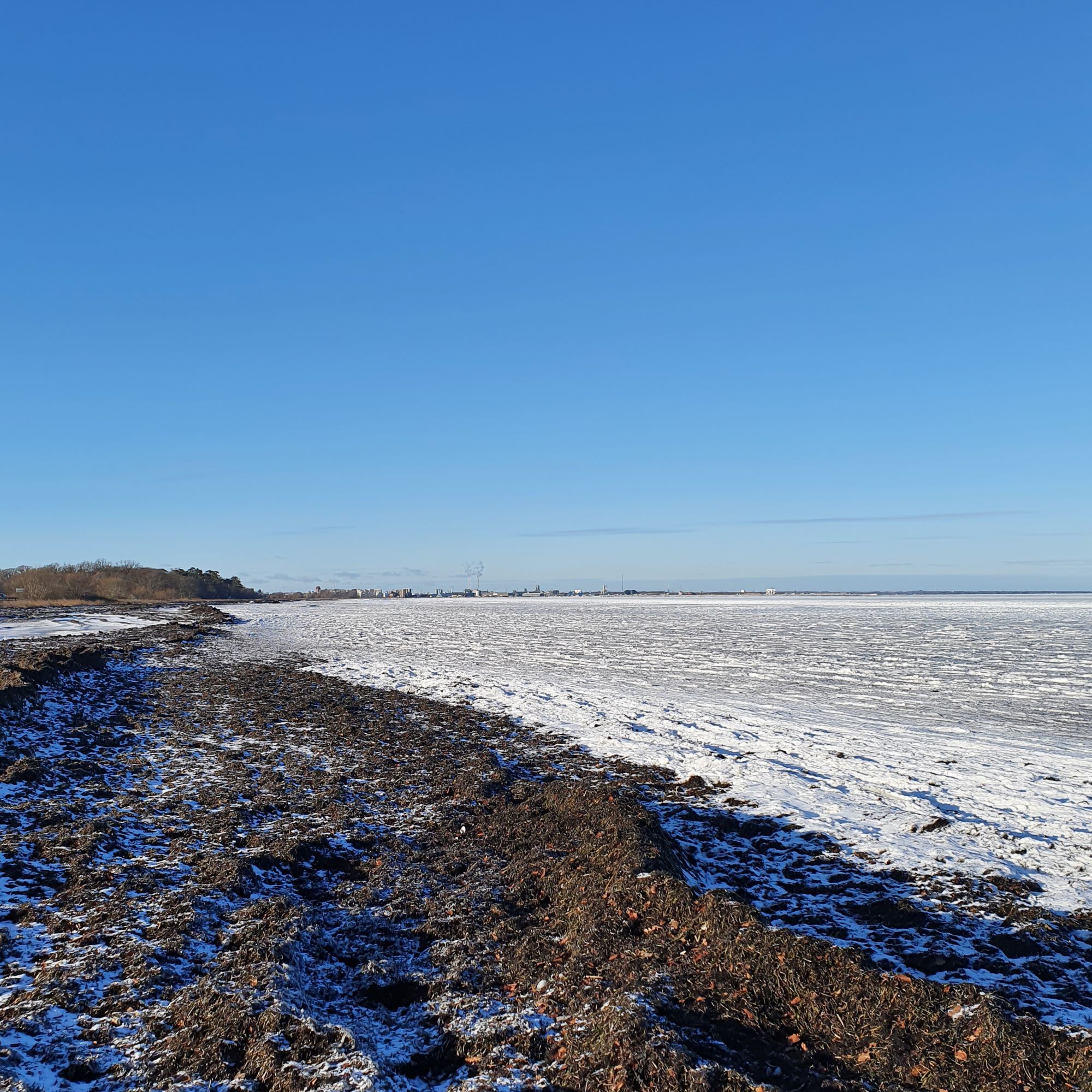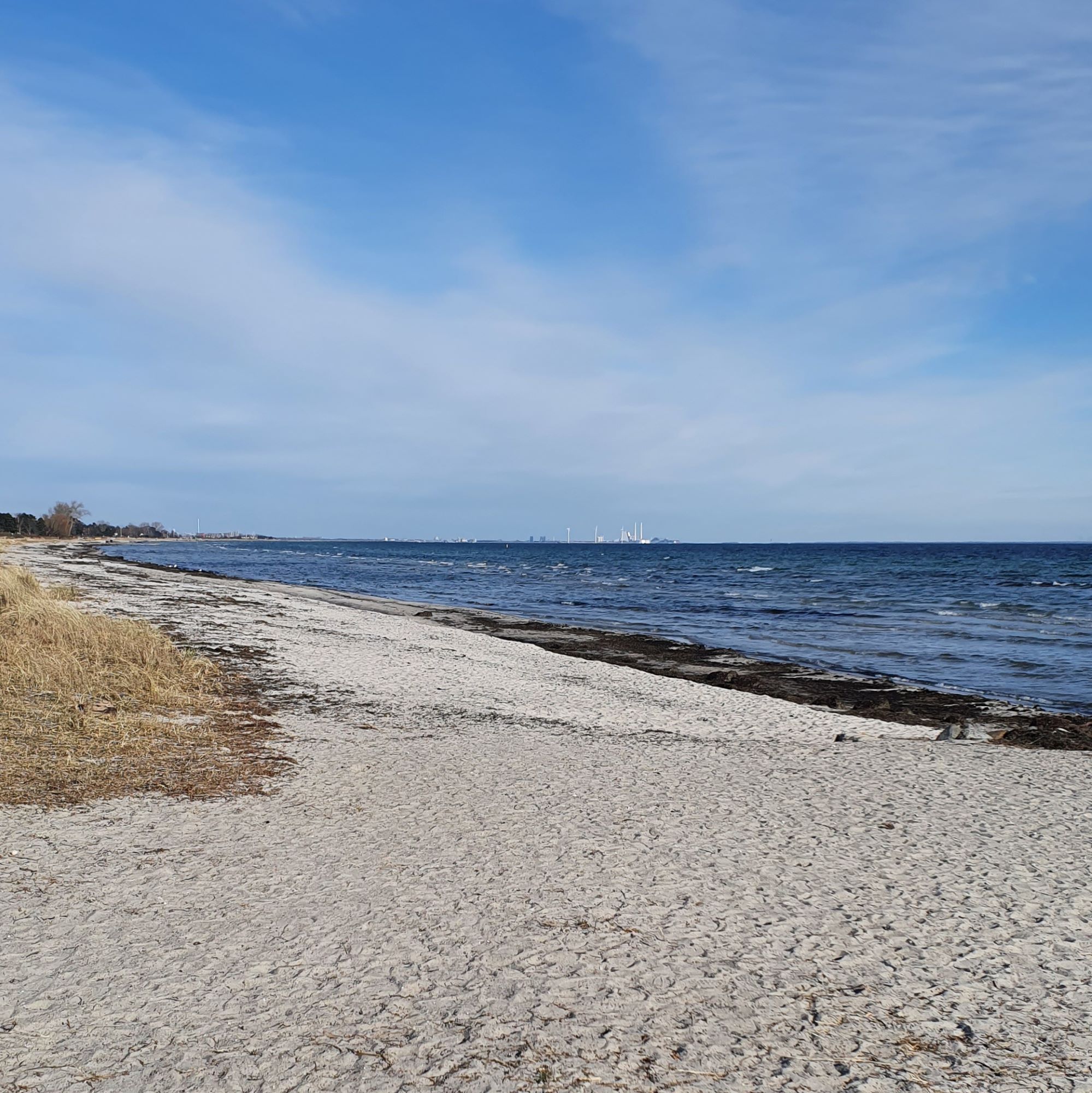 Her ser vi vi Køges skyline i baggrunden, og en bræmme med noget jeg har lært kaldes “fedtemøg”. Det er en slags et-årige brunalger, som når de dør skylles ind på land med vind og strøm. Det kan samle sig til store, tykke bælter, og det kommer til at lugte af svovl og råddenskab når det bliv er varmt i vejret. Ved de fleste badestrande bliver det fjernet om sommeren. Det kan blandes med kommunernes grønne affald, og blive til god, næringsrig kompost.