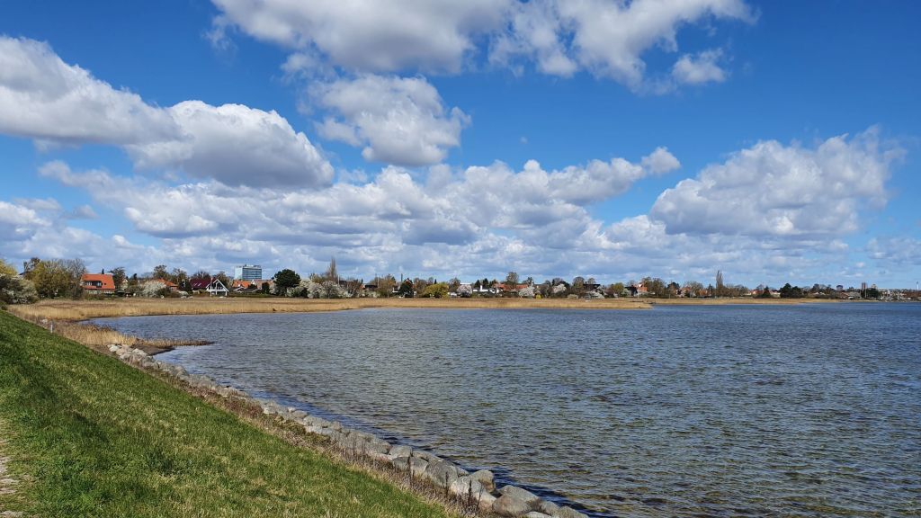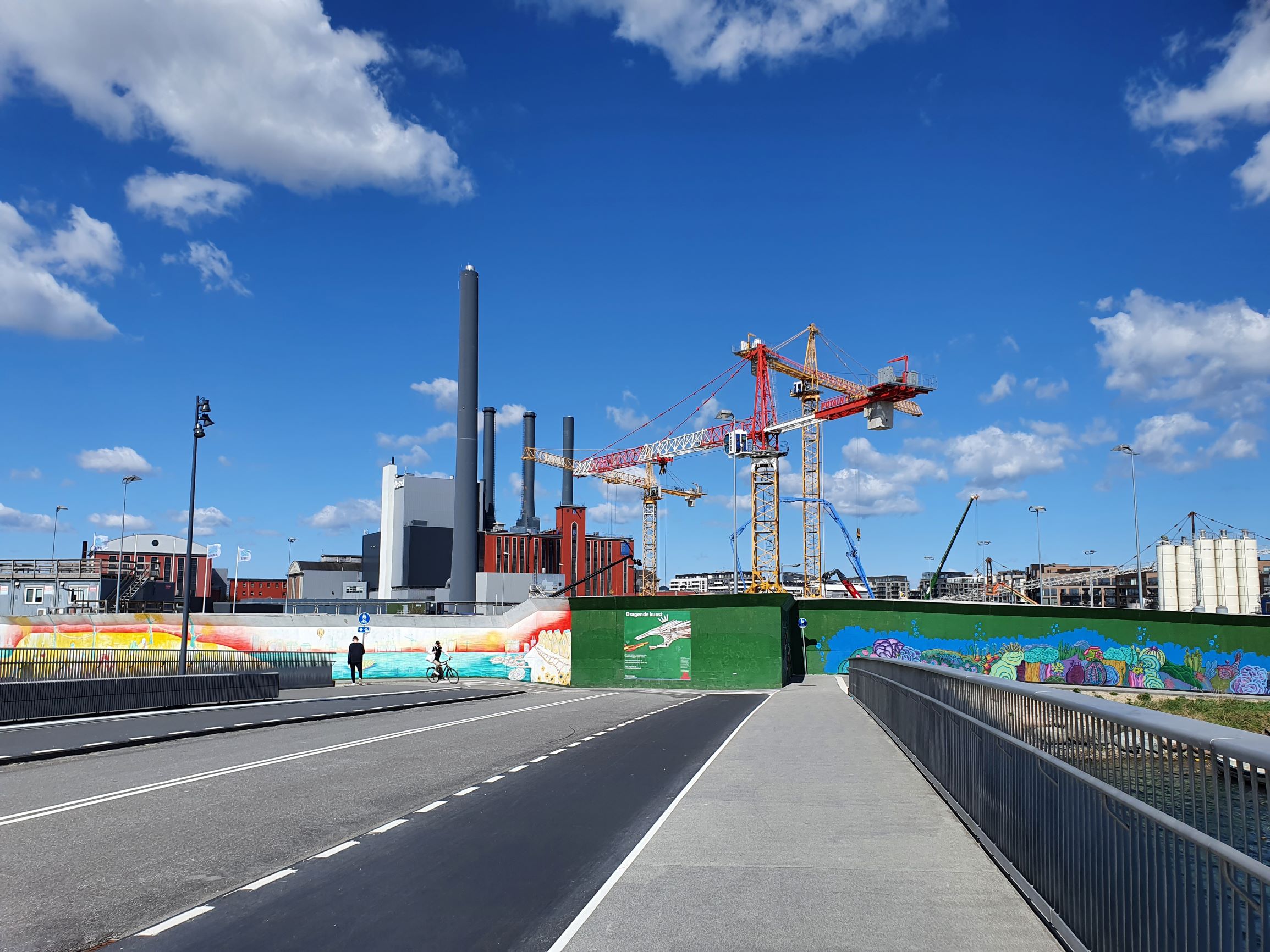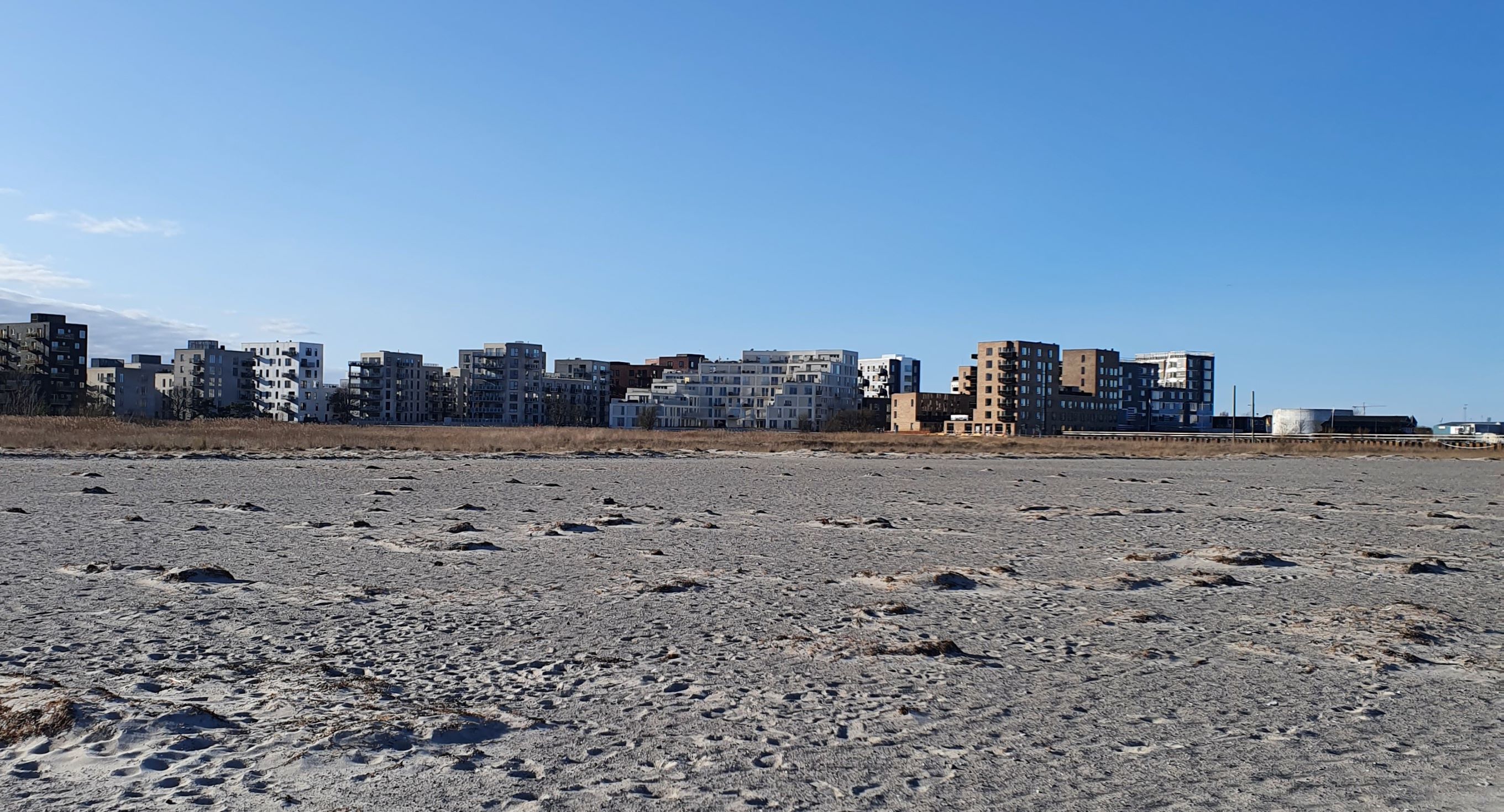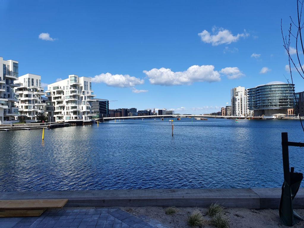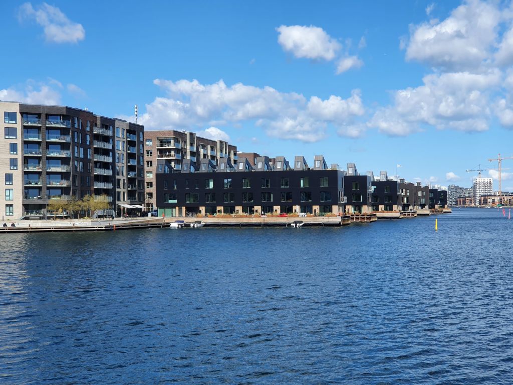 Når jeg kigger mod nord, ligger der en helt ny bydel. Det ligner lidt det nybyggeri man finder i Københavns havneområde, med variationer i former og farver på husene. Der bygges stadig, men man kan godt komme udenom langs med vandet. Byggeområdet skal rumme ca 1500 boliger, hvoraf ca en tredjedel er færdige på nuværende tidspunkt.