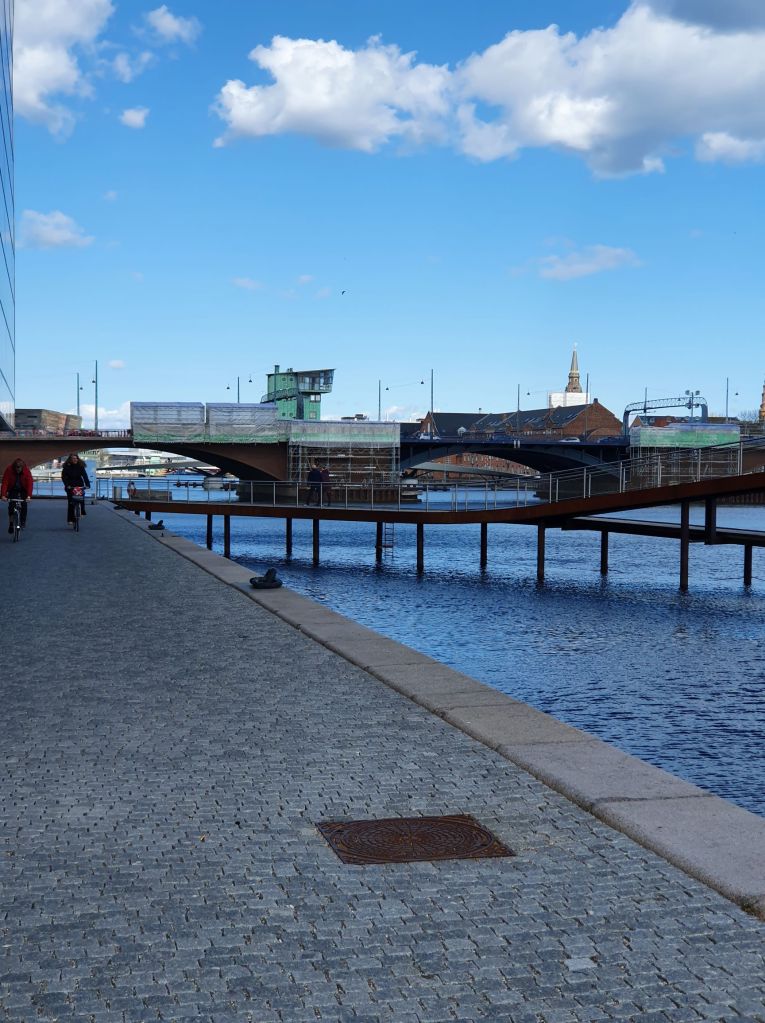 Vel ovre på den anden side af metro-byggeriet, kunne jeg endelig se noget jeg kunne genkende. Det er gå- og cykelbroen over til Islands Brygge fra Fisketorvet.