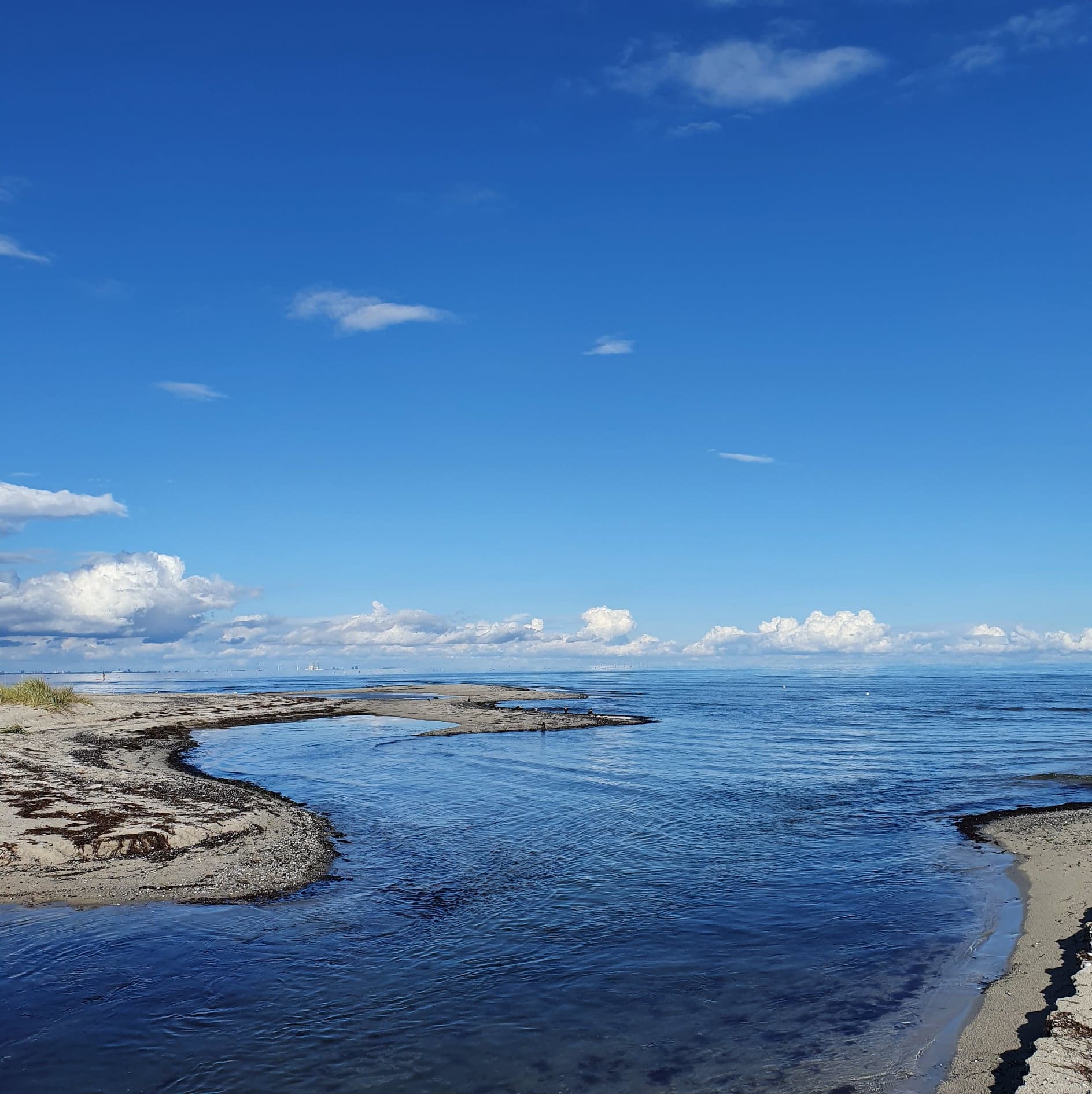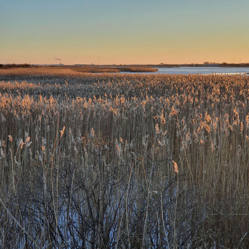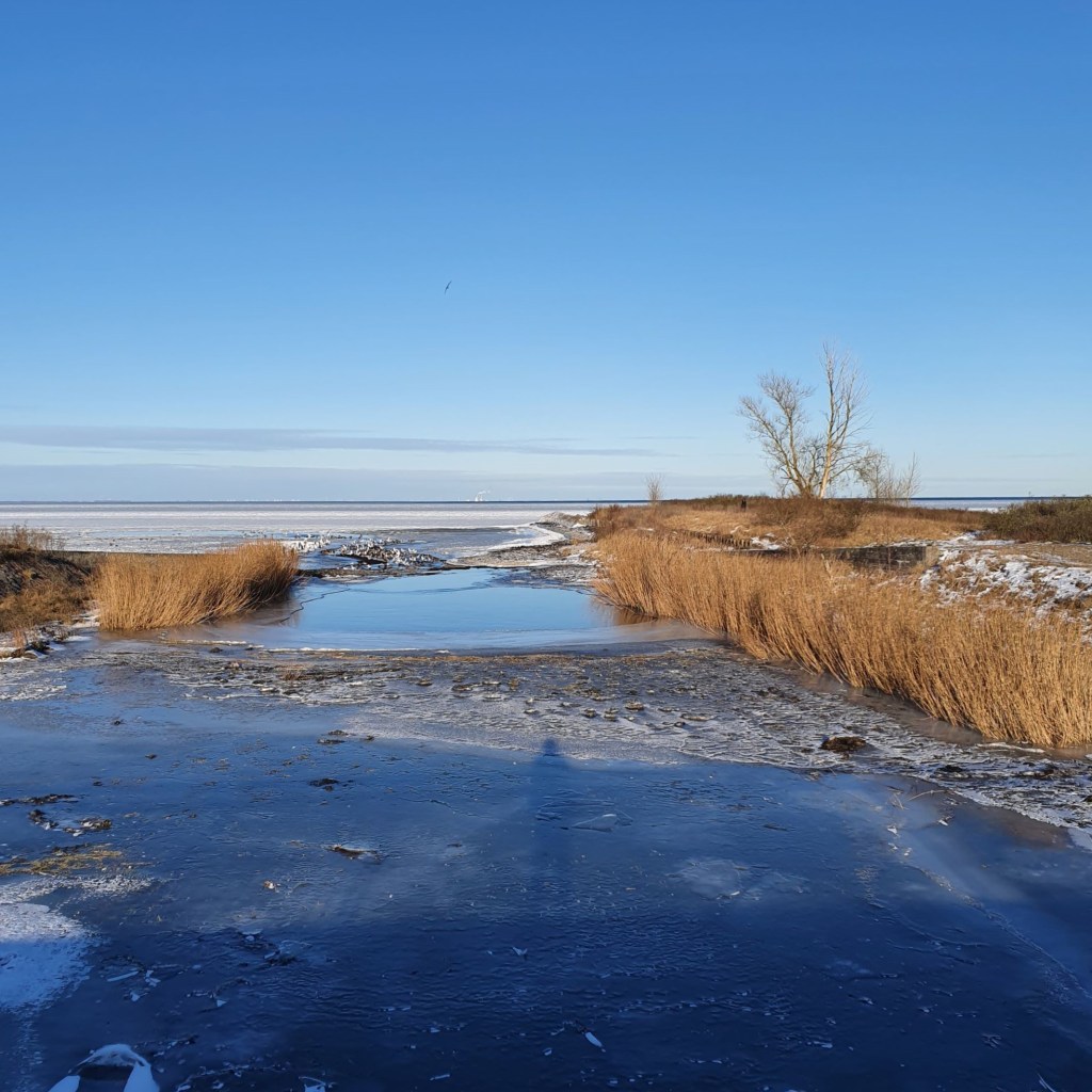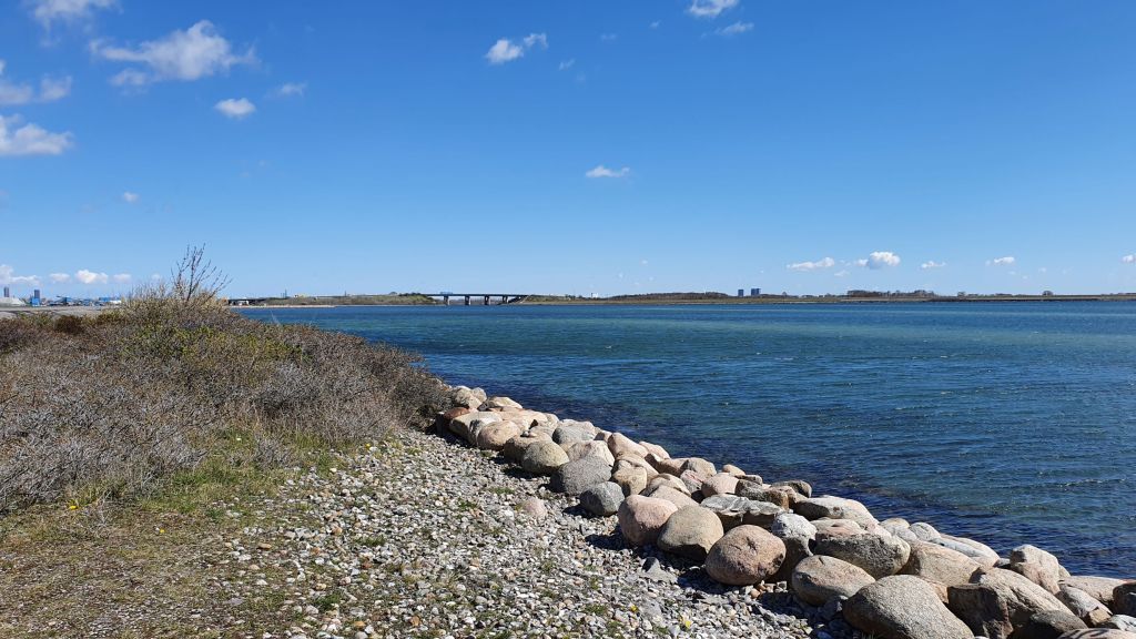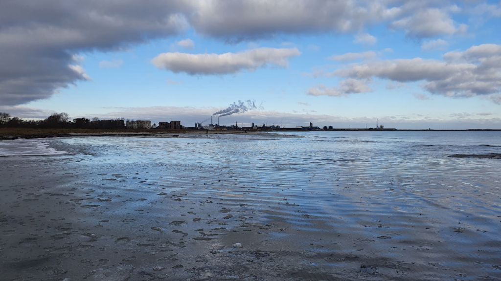 Udløbet af Tryggevælde Å. Den ligger lige før Prambrostranden ved Strøby Egede. Prambrostranden er min bardoms badestrand. Herfra var der kun en kort cykeltur til Vallø, hvor min mormor boede. Dengang kunne man kigge over bugten og se gasbeholderen på Valby Gasværk på den anden side af bugten. Den blev fjernet i 2012. Nu er det Avedøreværket der er det største man kan se i den retning. Mit telefon-kamera får ikke alle detaljer med, men man kan også se højhusene i Ishøj herfra.