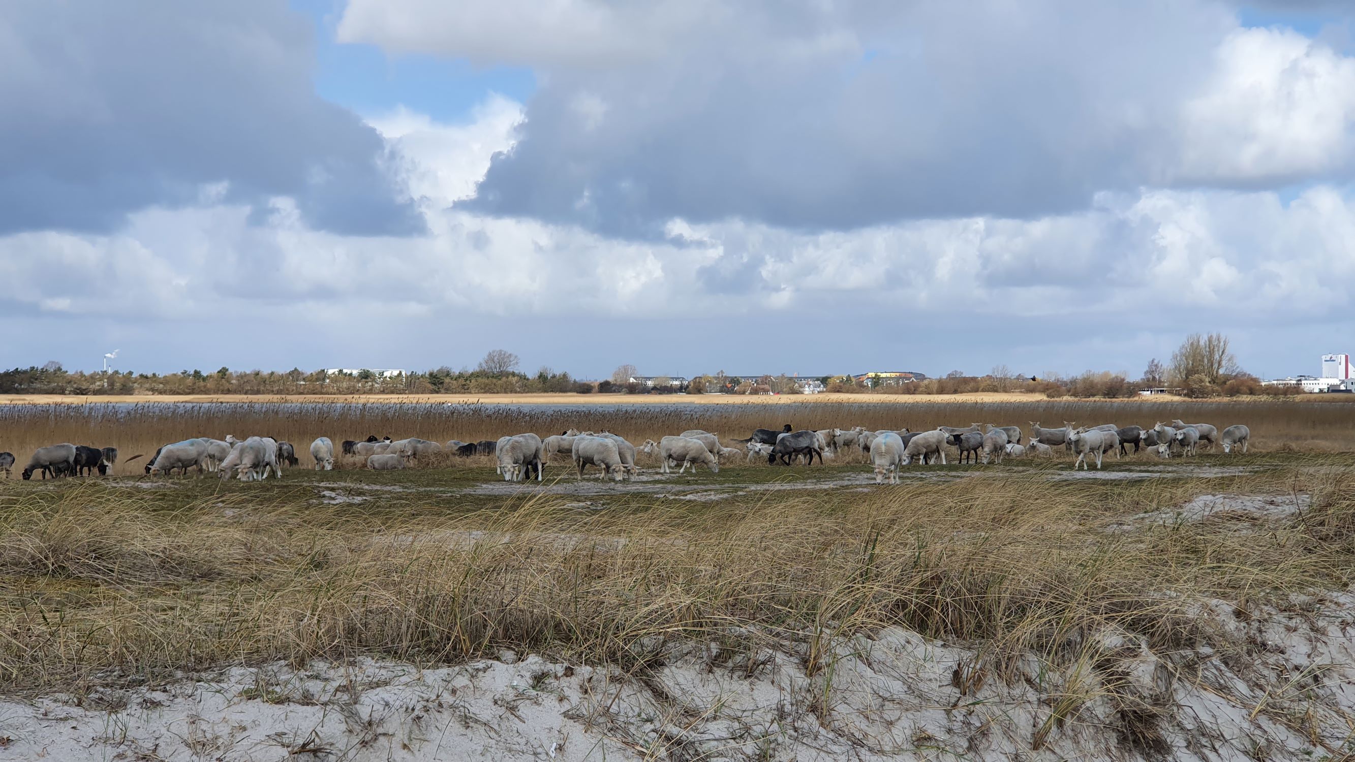 Der udsættes får forår og efterår, for at holde uønsket vegetation nede. Bag fårene ses lagunen, og bag den ligger bebyggelsen langs Københavnsvej, eller Gammel Køge Landevej, som den hedder i den anden ende.