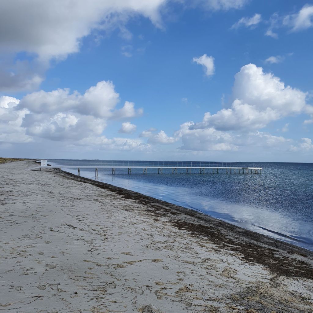 Ca midtvejs på revlen ligger min badebro. Og når jeg siger “min”, er det lidt sandt, for den blev opført sidste år, på initiativ af en forening i Køge Nord. Lokale virksomheder, foreninger og enkeltpersoner har bidraget med større eller mindre beløb. Badebroen ligger udfor det sted hvor man kan komme ind på den anden side af lagunen, over to små broer.