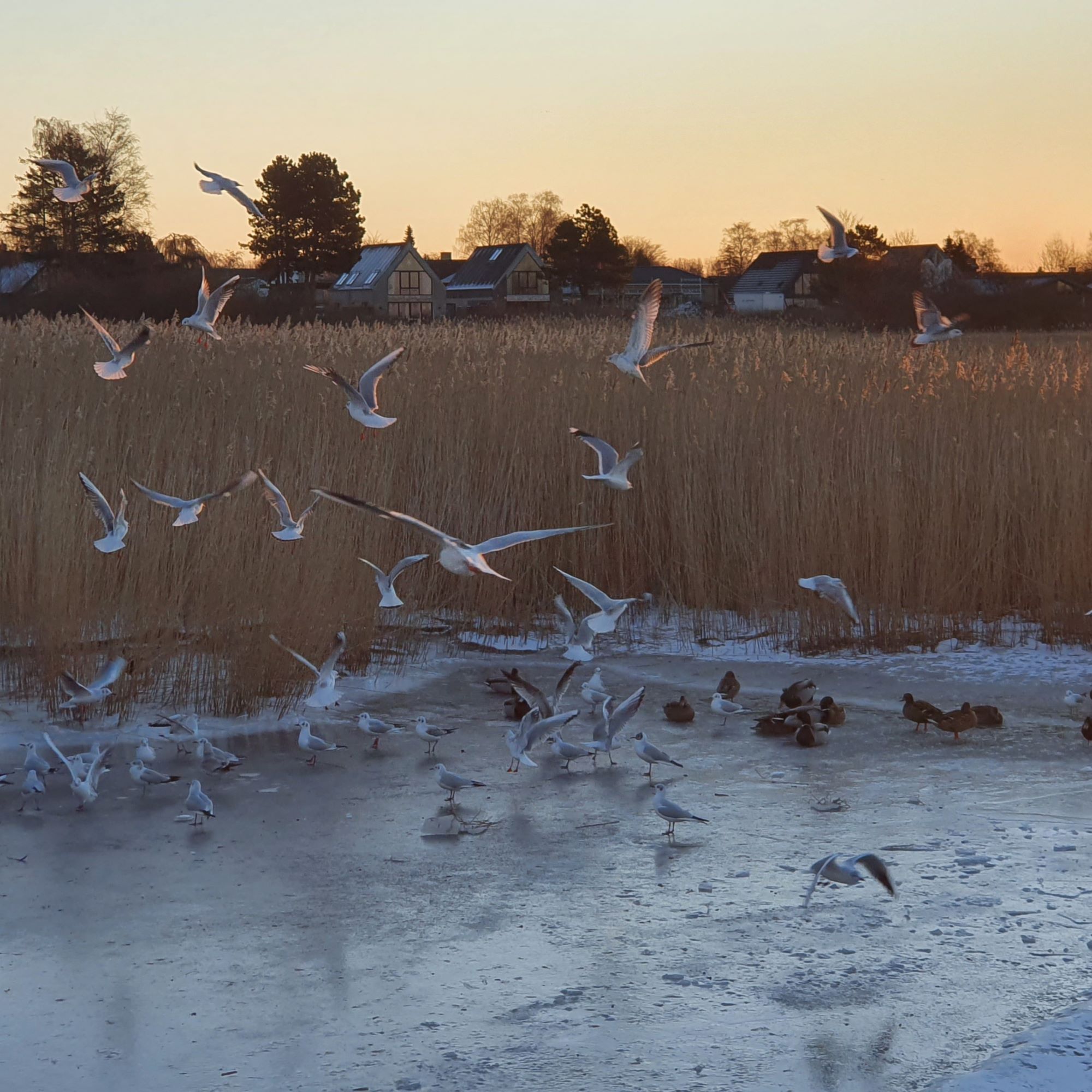 Der var et livligt fugleliv på isen mellem revlen og Jersie ved solnedgangstid.