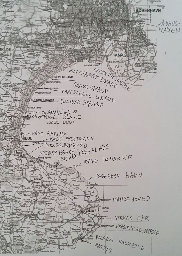 Jeg har også brugt Google Maps til at finde afstandene. Der er ca 75 km fra Rødvig til København, så selv om jeg har gået alle etaper, (på nær den sidste) frem og tilbage, bliver det altså ikke mere end ca 150 km. Jeg har delt det på 18 etaper, så det bliver i snit 8,3 km pr etape. Det passer meget godt til den daglige gåtur, når man også har andet på programmet end at gå.