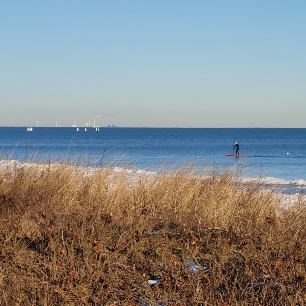 Selv om badning ikke frister for de fleste, var der andre der tog sig en tur på paddelboard. I baggrunden ses avedøreværket. Det der ligner sejlbåde, er bundgarnspæle der er iset til.