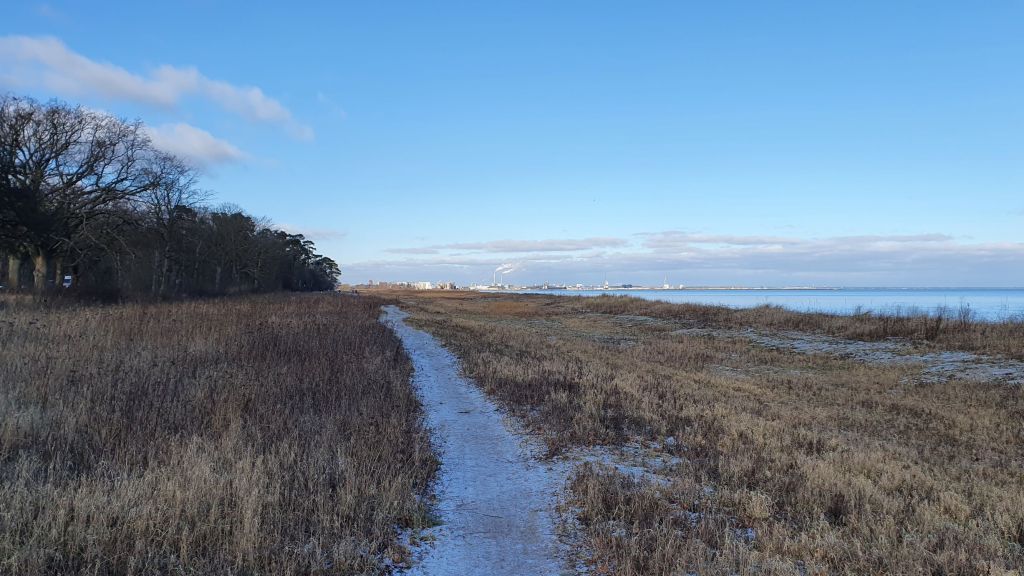 25. december 2020. Jeg havde stadig ikke defineret mit mål om at gå til København langs vandet. Men jeg ville gerne vise Helle My Bøgeskov Havn, hvor jeg havde været før. Jeg synes det er et meget specielt sted, med den lille havn, og skoven nord for, der går helt ned til vandet. Vi besluttede at gå en tur langs med vandet til Køge Sønakke, hvor Køge bugt starter.