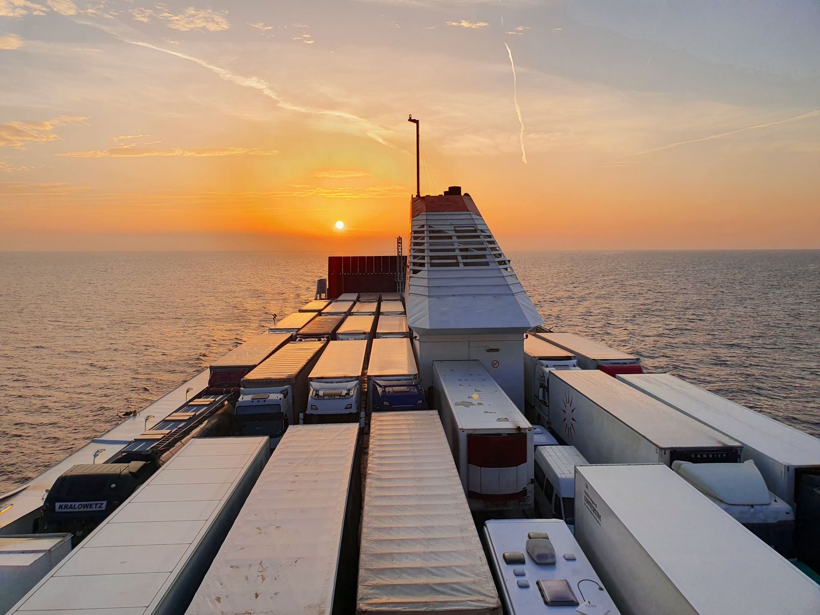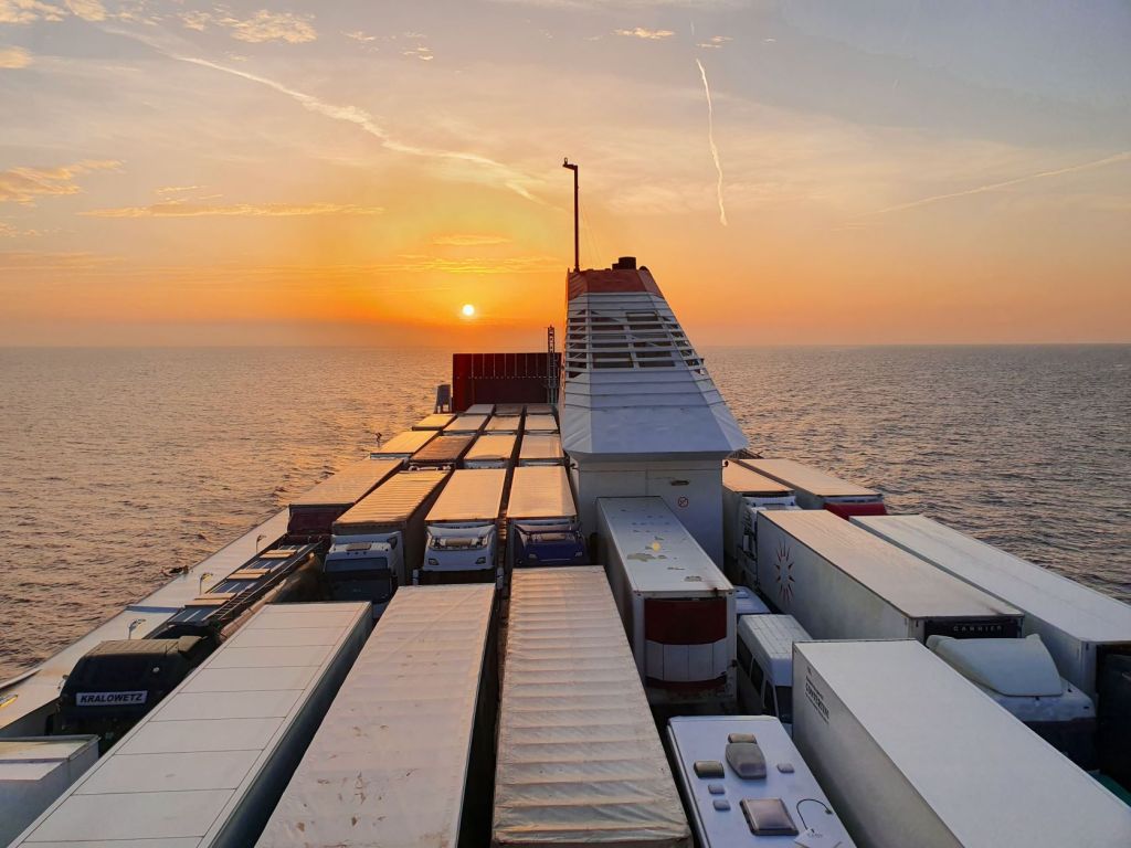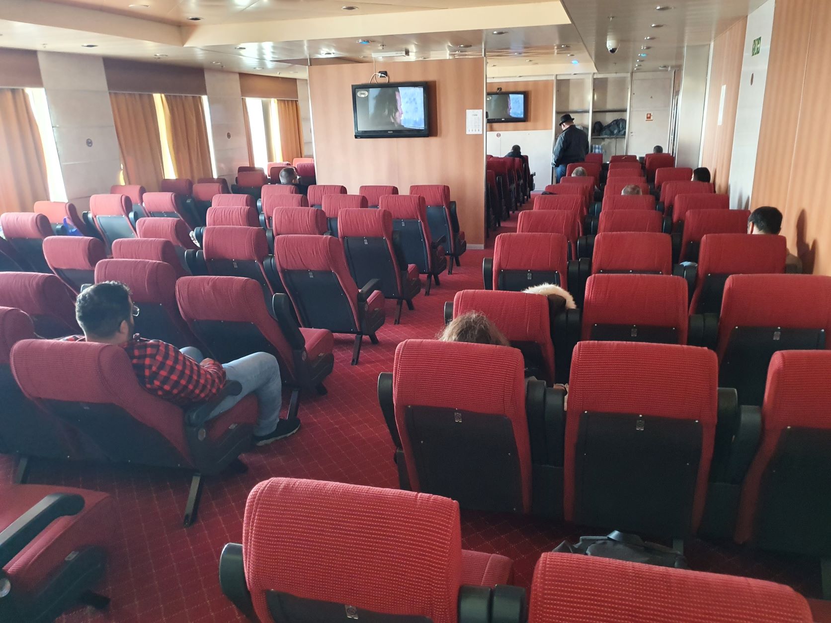 Færgen var tydeligvis mest beregnet til lastbiler med containere. Men der var hvad der skal være af cafeteria, bar og siddepladser ude og inde.