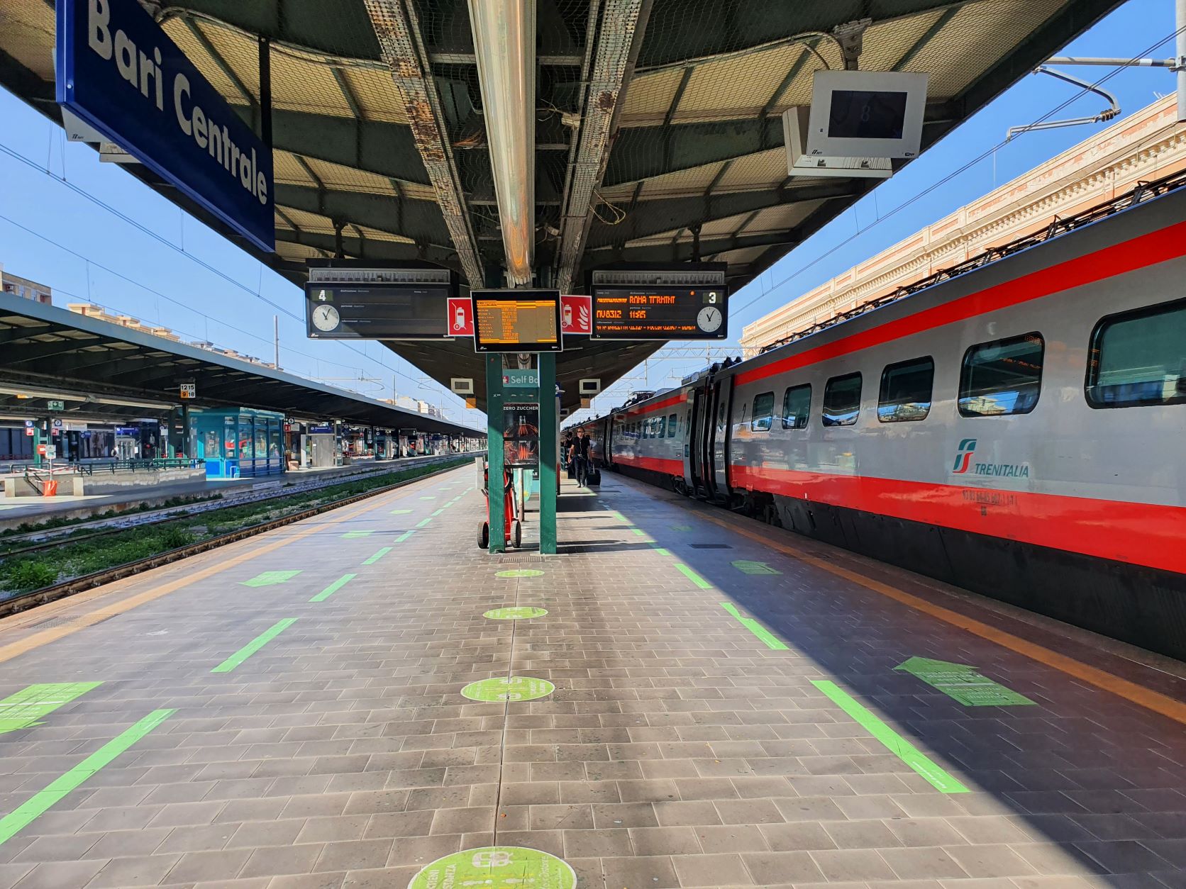 Næste morgen kunne vi se det italienske fastland, stadig i flot vejr. At komme til stationen fra færgen var lidt bøvlet, for det er en ret stor havn, og ikke beregnet på gående trafik. Der gik vistnok en bus, men jeg valgte at gå. På den måde fik jeg også set en smule af Bari by. og købt mig en lækker pizza til togrejsen.