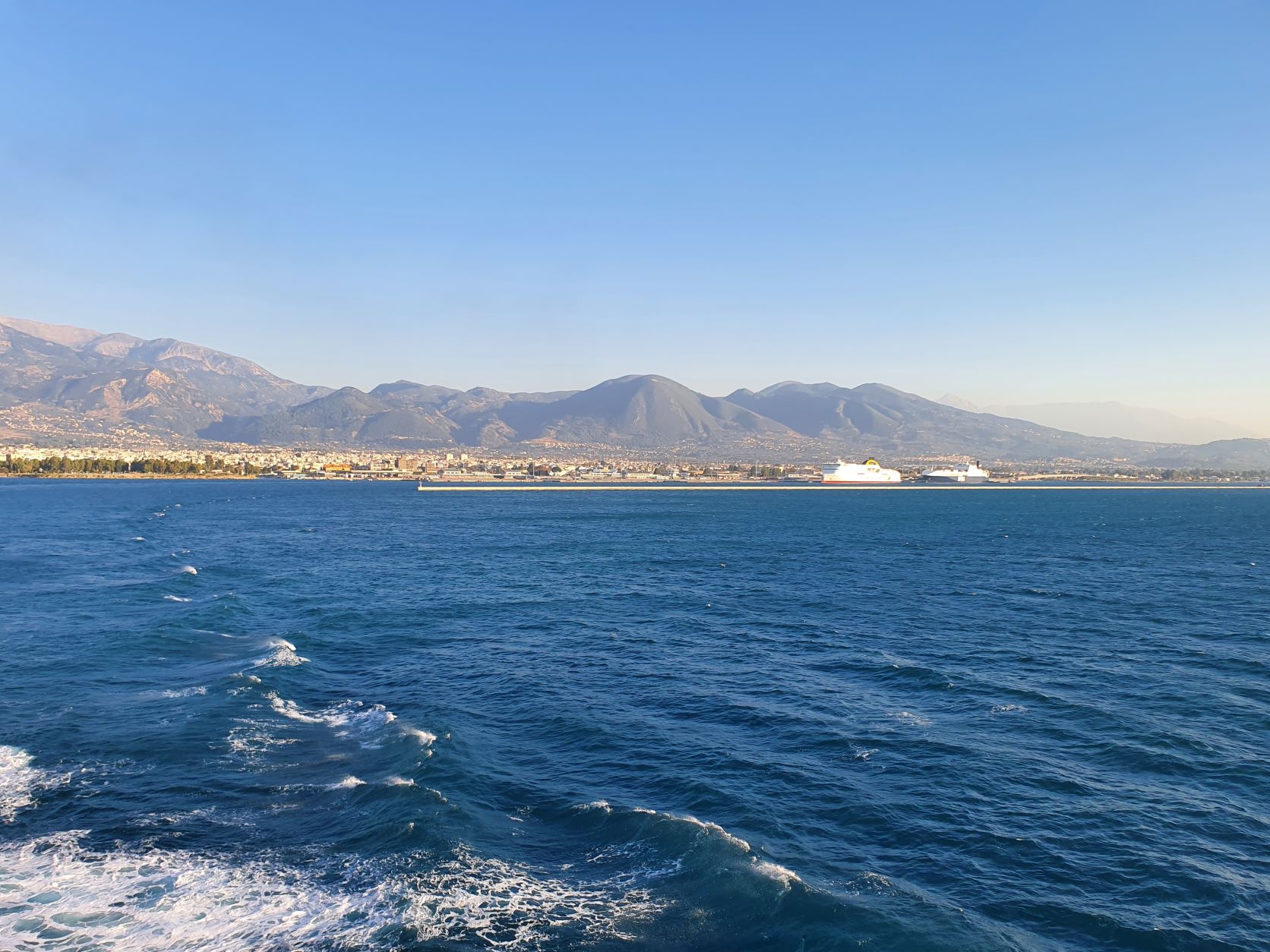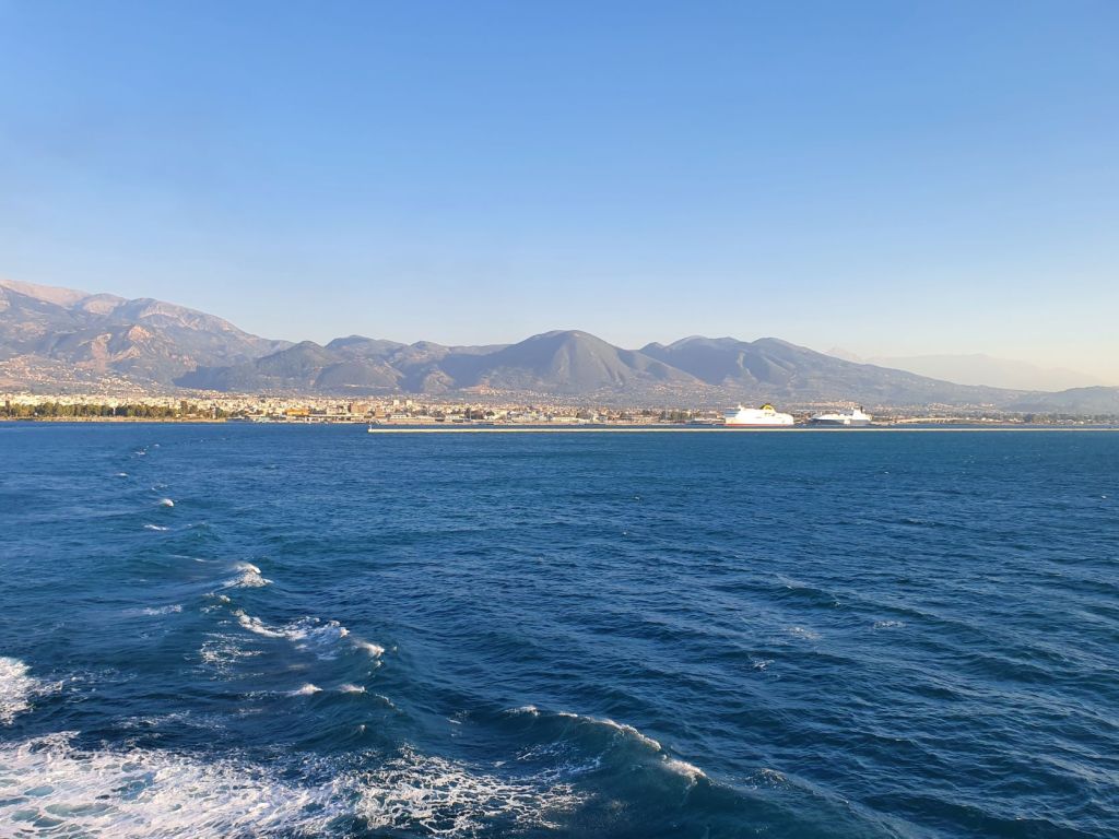 Udsejlingen fra Patras var meget smuk. Vejret var mildt og himmelen klar. Vi sejlede kl. 17.30, så indtil det blev mørkt ved 19.30 tiden, var der flot udsigt til fastland og øer vi sejlede forbi. Færgen sejler langs kysten af Grækenland, og gør ophold i Igoumenitsa i Nordgrækenland, før den krydser over Adriaterhavet til Italien. Sejlturen tager 16 timer.