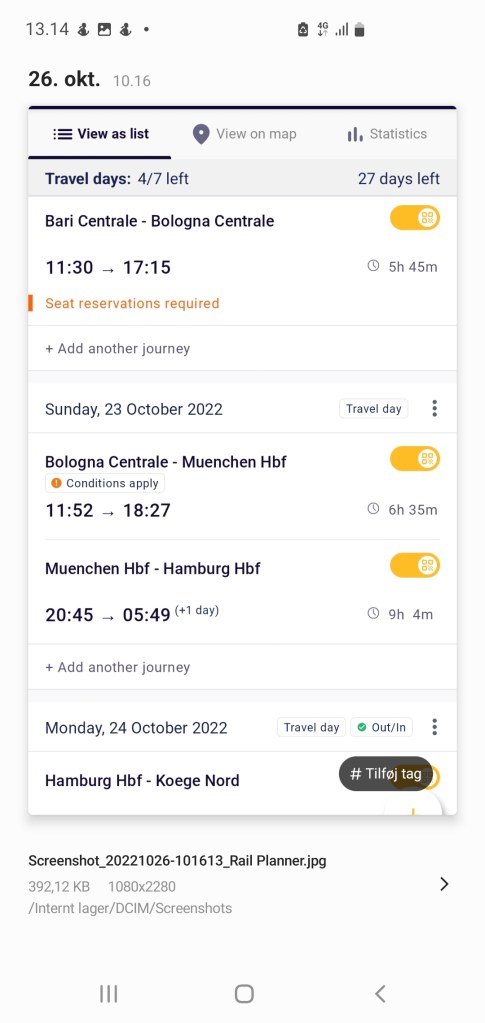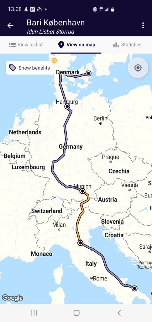 Jeg valgte Bari, som er den sydligste. Kahytterne var sindssygt dyre, fordi jeg var sent på den, og der kun var luksus kahytter til rådighed. Så jeg valget Air Seat, som næsten ikke koster noget. Det var jo kun en overnatning, så det kunne nok gå. Derfra var det nemt nok at bestille tog resten af vejen. Billetterne lægges ind på telefonen, og de kan ændres under vejs, hvis man skifter mening. Jeg valgte at have en overnatning i Bologna. En stillestående overnatning, mellem to der bevægede sig ville være godt, tænkte jeg.